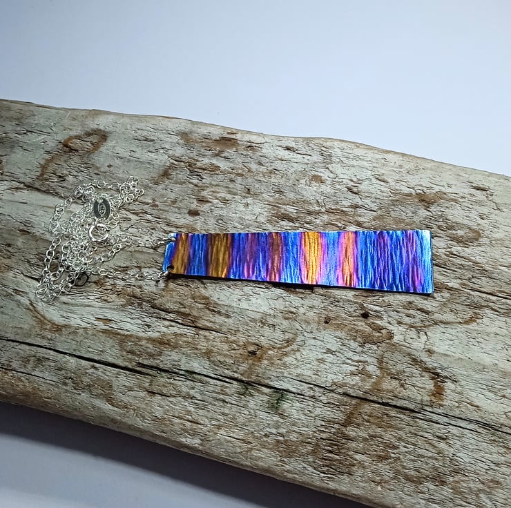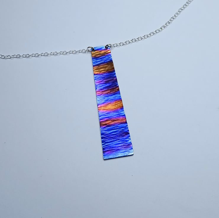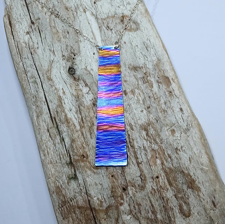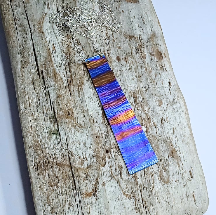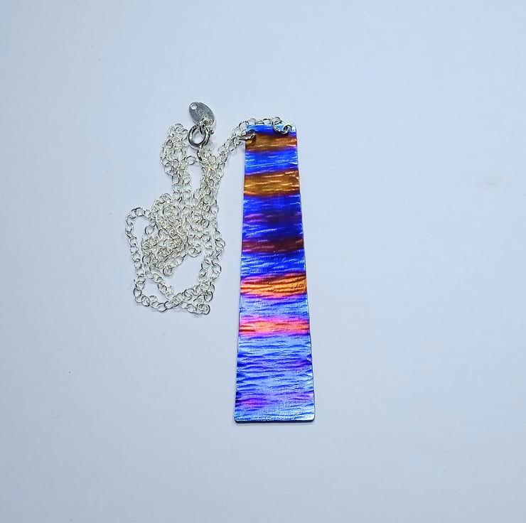I have made this necklace by hand sawing the shape from titanium sheet and have given the surface an attractive line hammered finish before heat colouring. I have then attached sterling silver chain to create the necklace.