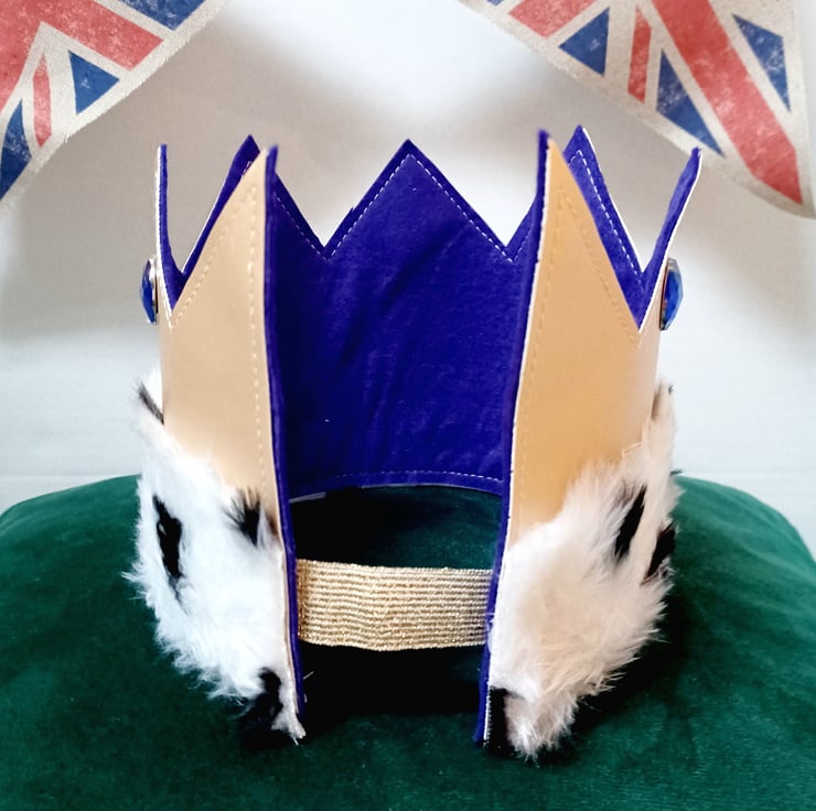 The crown has a matt metallic look with Purple Felt backing , with a gold elasticated back strap for ease of fit on the head..and a Faux Fur trim..plus gemstone embellishments.
