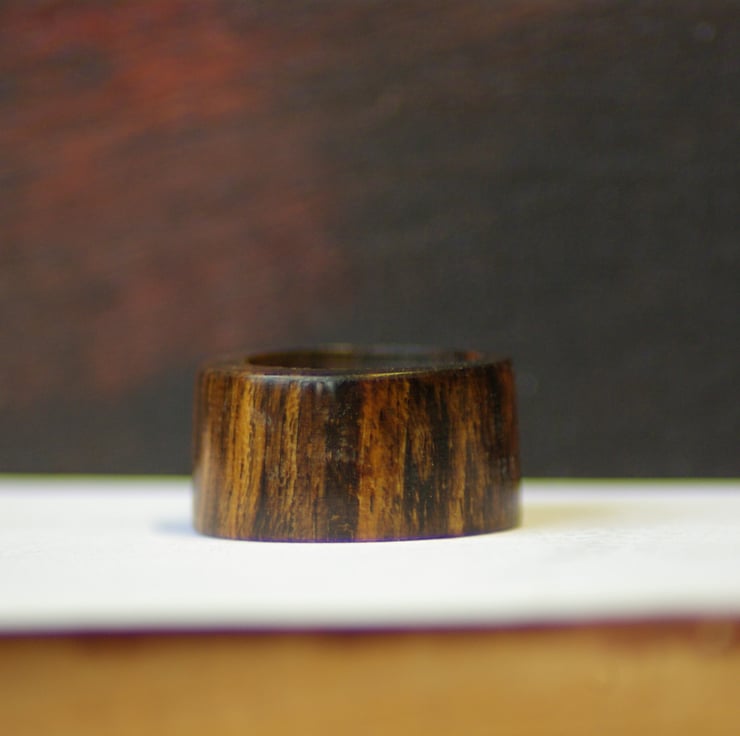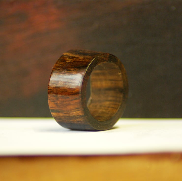 Solid wooden ring made with hand tools only. made to order for sizing with a high gloss coating to finish.