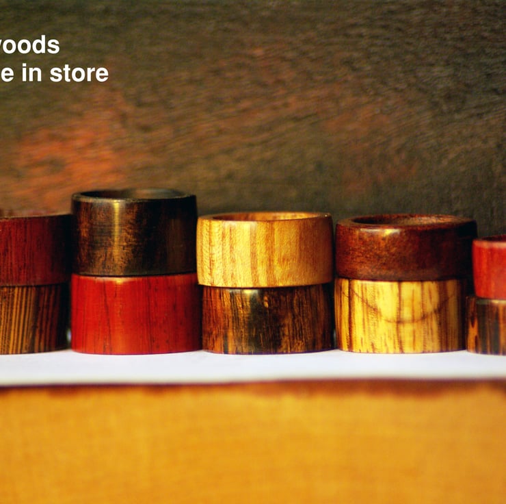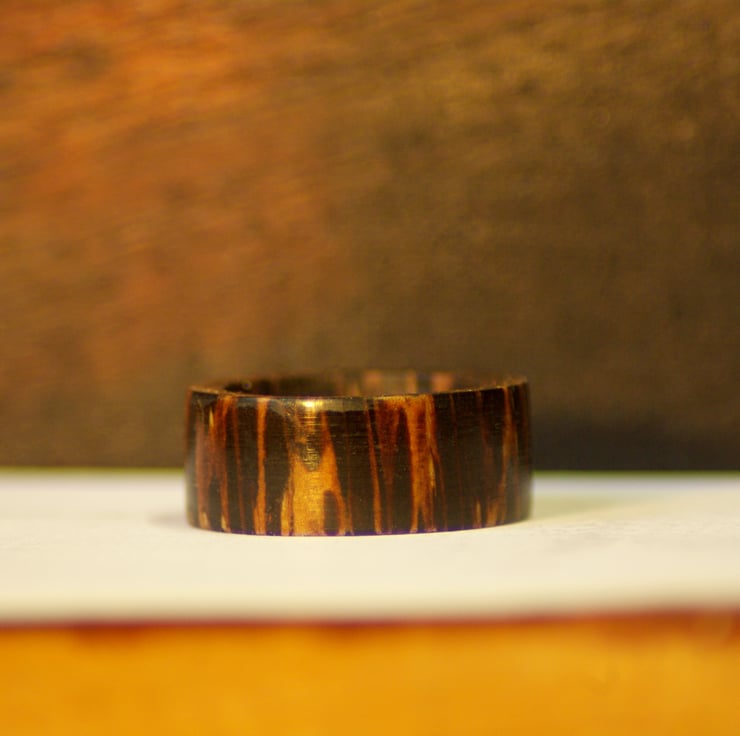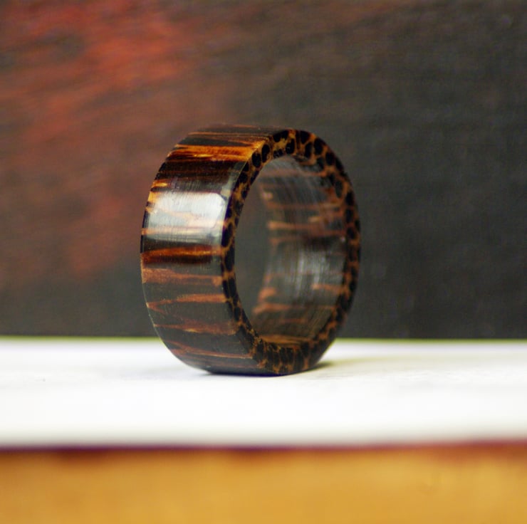 Solid wooden ring made with hand tools only. made to order for sizing with a high gloss coating to finish.