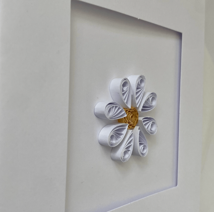 This card has been handmade using strips of paper in an art form called Quilling.