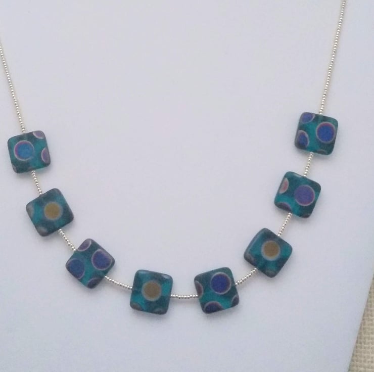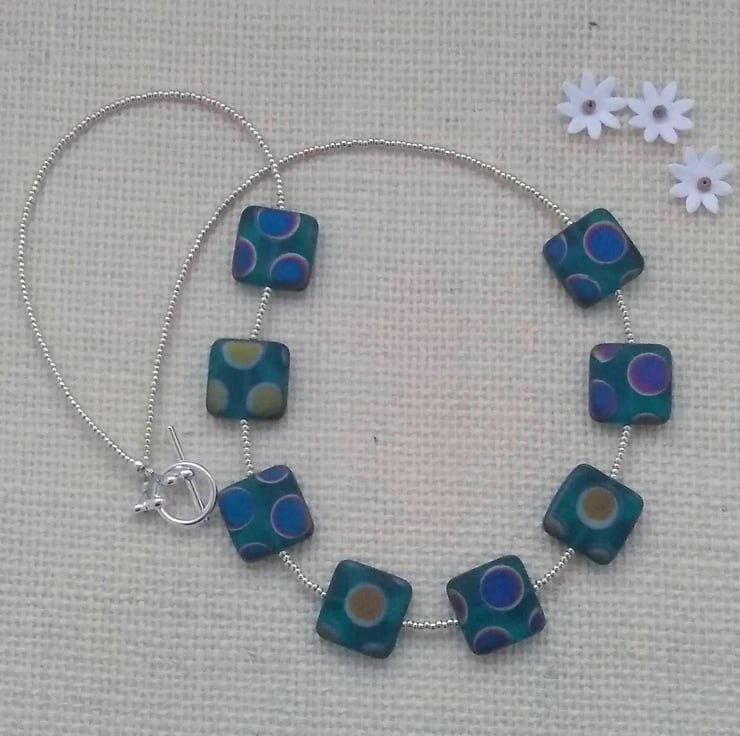I made this necklace using Czech glass square beads in aquarmarine with a peacock effect. I used tiny glass beads in between. The necklace measures 18" and is finished with a silver plated toggle clasp. The necklace comes with a black velvet gift pouch.