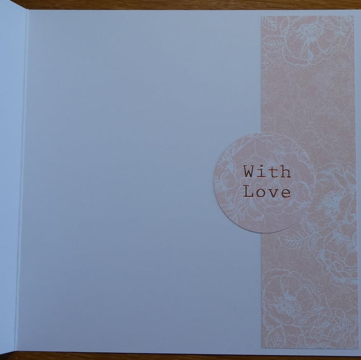 A circular message with the words 'With Love' in copper foil and a strip of matching peach paper have been added down the right hand edge of the inside of the card for a finished look.