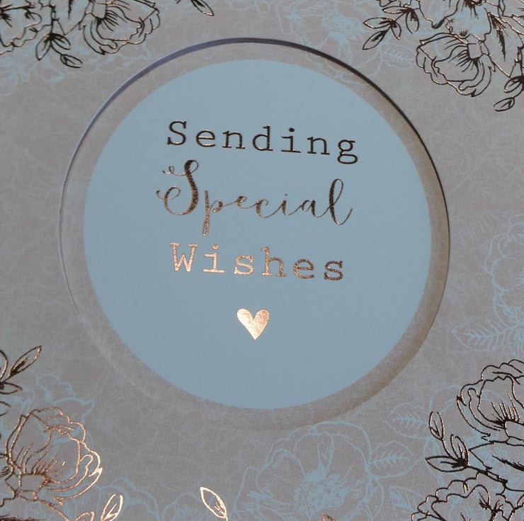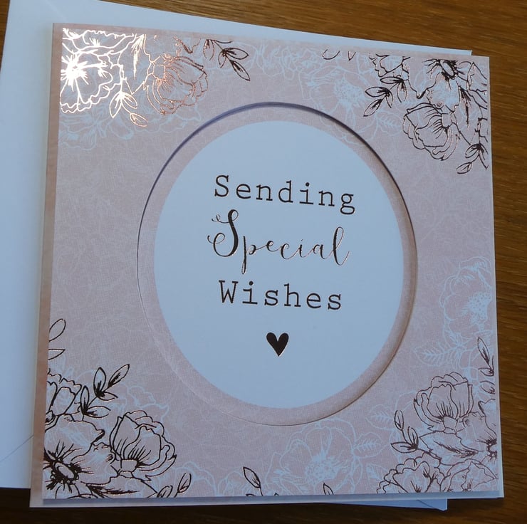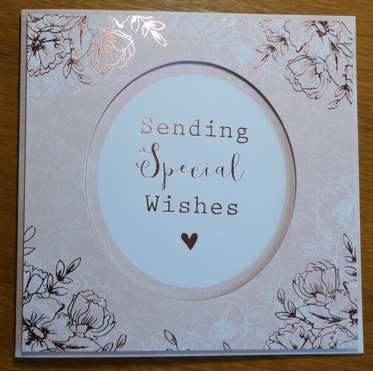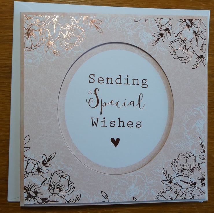 This elegant floral card in shades of peach, white and copper with the message 'Sending Special Wishes' would be suitable for many different occasions, such as Birthday, Anniversay or Mother's Day.