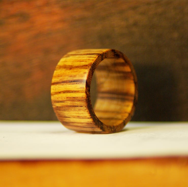 Solid wooden ring made with hand tools only. made to order for sizing with a high gloss coating to finish.