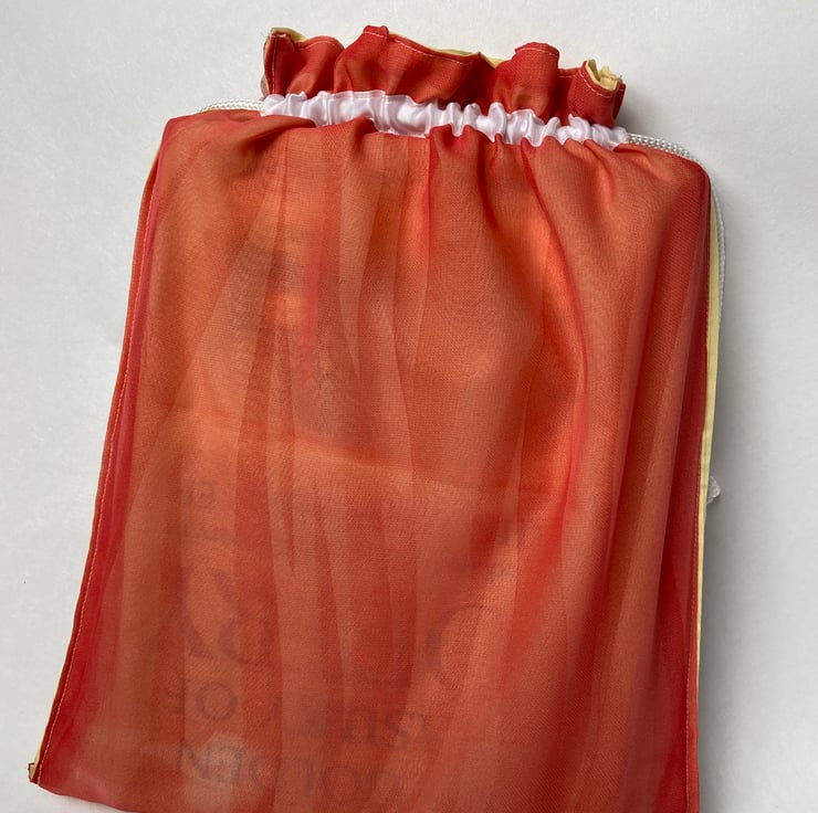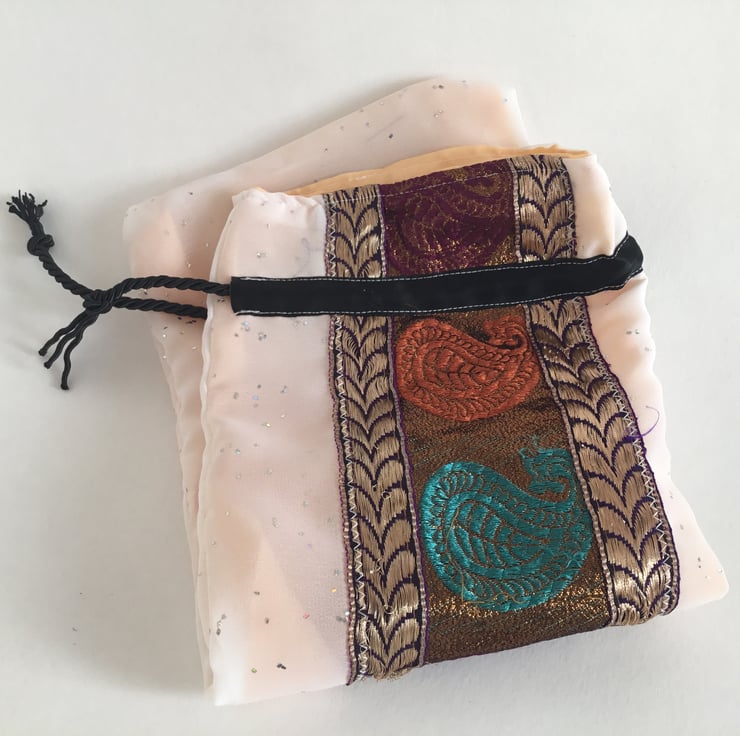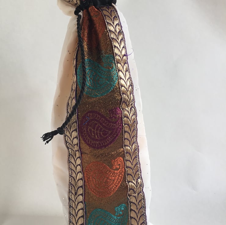 A cream bottle-sized drawstring bag, decorated with gorgeous brocade and lined with pale yellow lining. A normal sized bottle of wine or spirits will fit in it beautifully or you can use it for any appropriately shaped gift. It measures approximately 14 x 38cm.