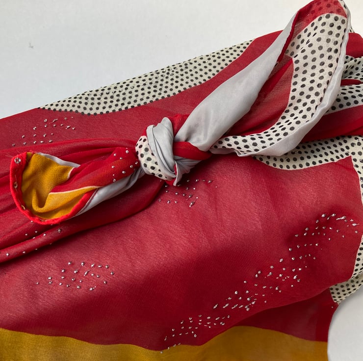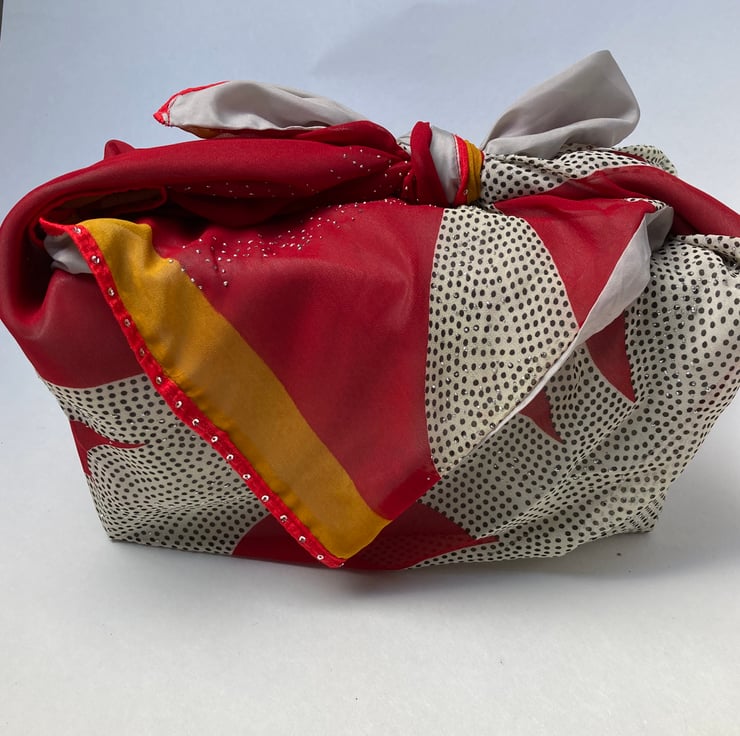 A large, lined gift wrap. The main fabric is a gorgeous red, black and white design, decorated with sparkles. It is lined with plain grey lining and measures approx. 78cm square.