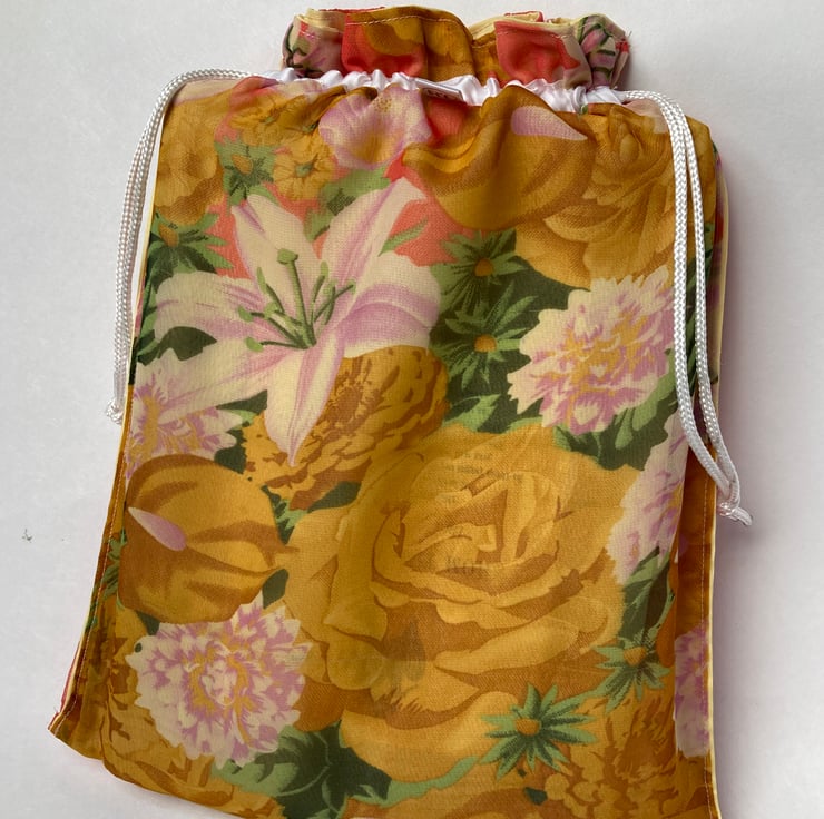 A medium-sized, drawstring gift bag made from a pretty floral fabric and lined with plain yellow, measuring approx. 26 x 32cm.