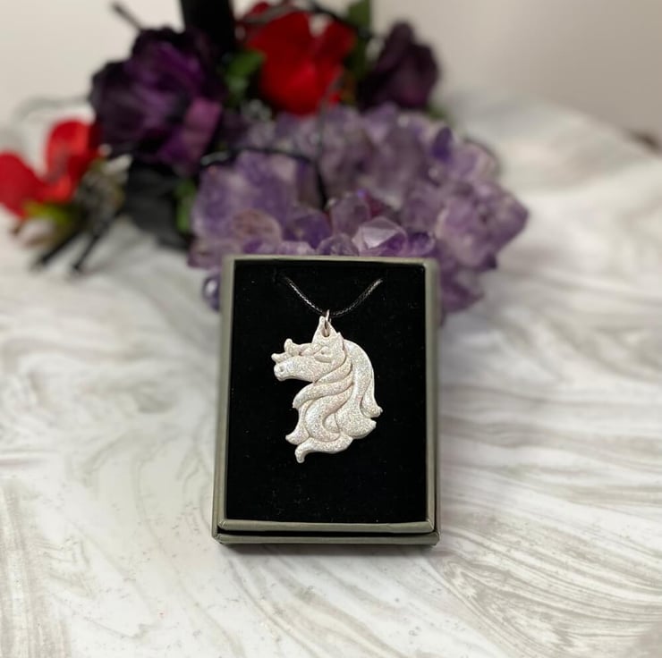 The unicorn is approximately 4 cm (1.5 inches) in size and hangs from an 18 inch black cord chain with a silver plated clasp and extension chain. Your necklace will be sent to you boxed.