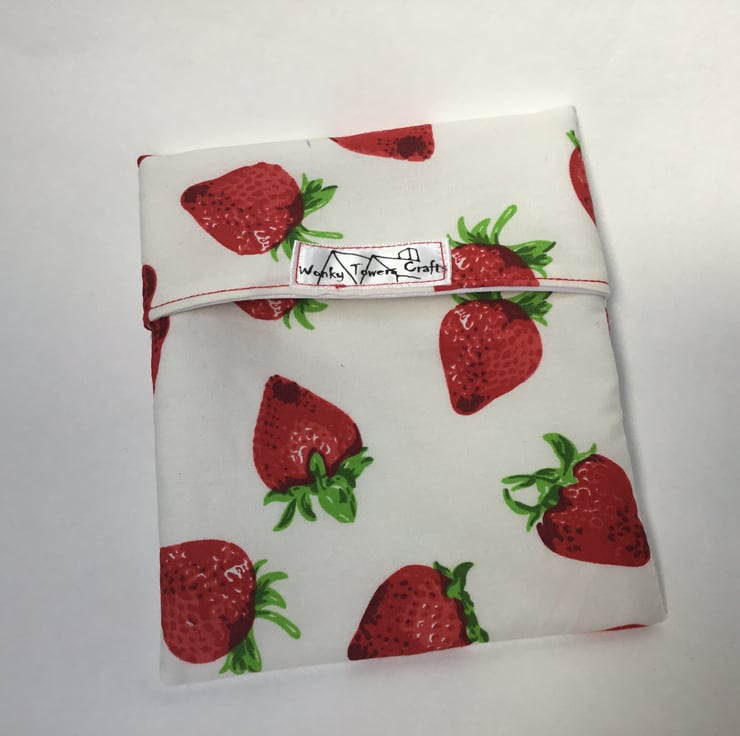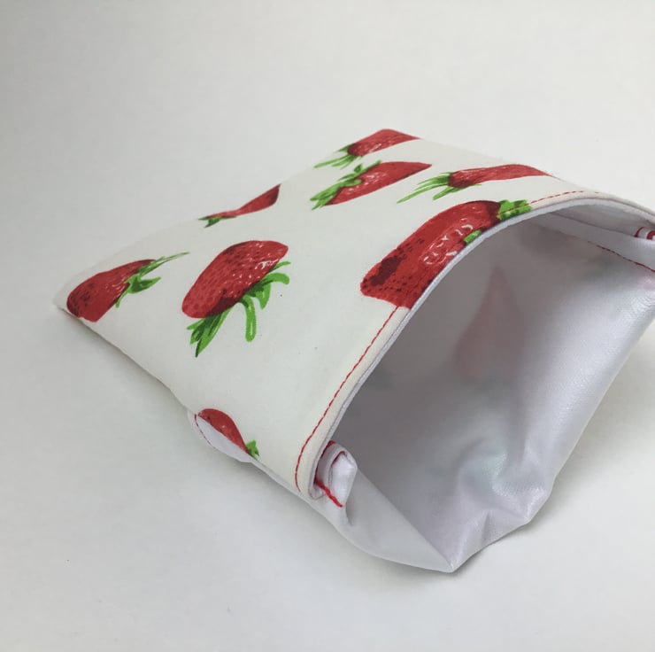 This generous-sized snack bag is designed to hold a substantial snack, an apple or a couple of rice cakes. It is also ideal for storing small left-overs in the firdge or freezer. The outside is made from attractive cotton and the inside is food safe PUL. This fabric is an eco-friendly soft and flexible material and is safe to use over and over again in contact with food - more details below. It can be wiped clean or washed by hand or in the machine. You can even smarten up your bag by ironing it with a medium iron, should you choose to.
