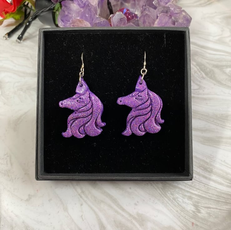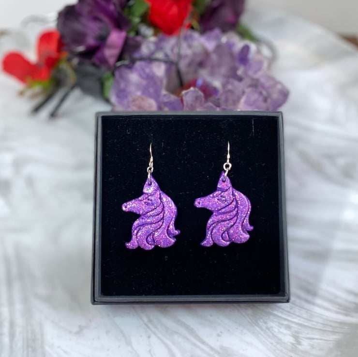 Purple unicorn glitter polymer clay statement earrings on sterling silver ear wires. Handmade with purple polymer clay and ultra fine purple glitter on sterling silver ear wires. These stunning fantasy large earrings would make an ideal gift for any unicorn lover.