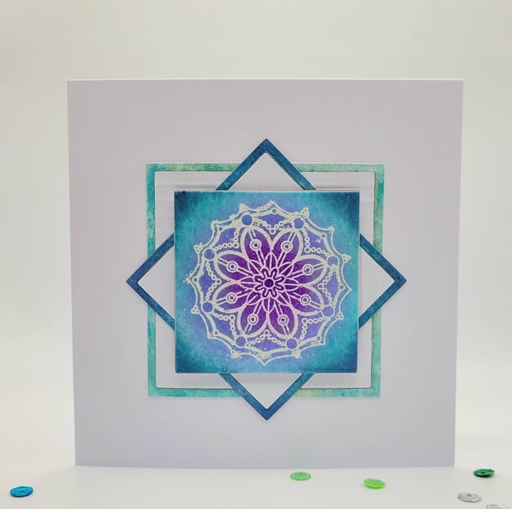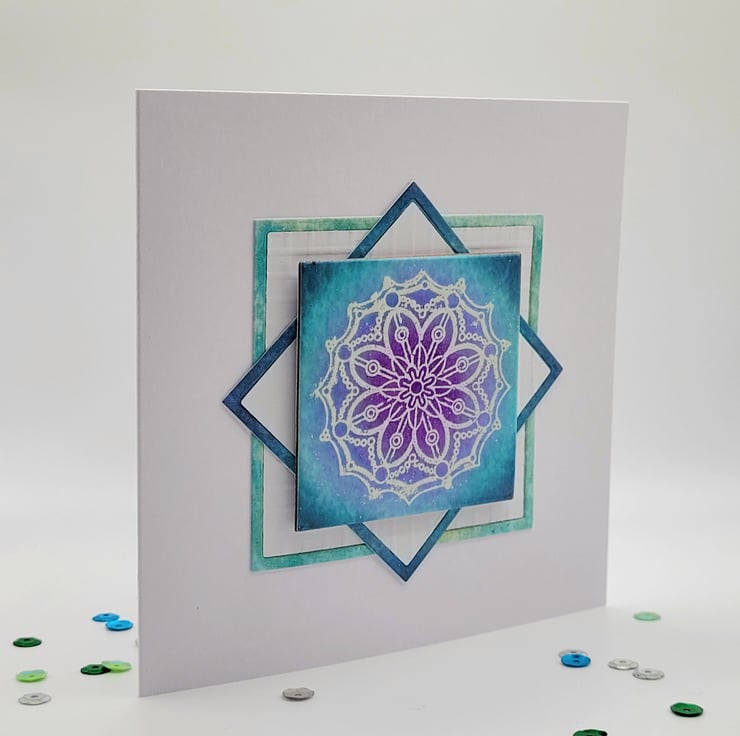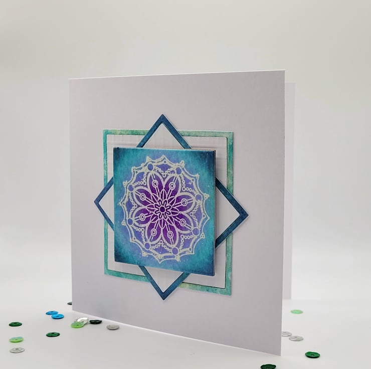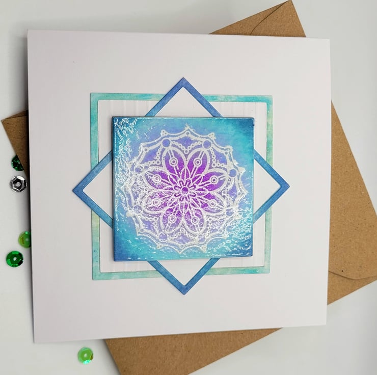 A individually handmade dimensional blank card, featuring a patterned 'tile' and square and diamond frames. The card is 12.5 x 12.5 cm and will be supplied with a 100% recycled brown kraft envelope. Blank inside for writing a note or greeting, great for lots of occasions like birthdays, new home, father's day. A unique, art style card that would be hard to find on the high street!