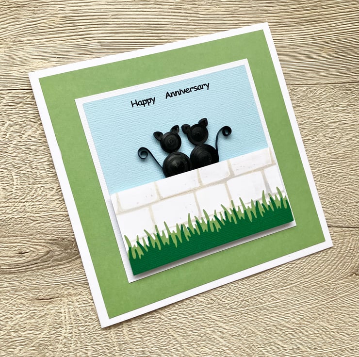This adorable anniversary card has two quilled black cats sitting side by side on a garden wall.