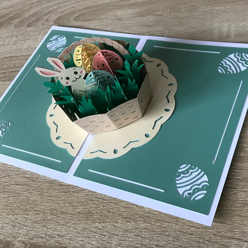 This card is a pop up card of a Easter bunny in a basket with eggs. Each card is handmade on receipt of order, this may mean that colours may vary slightly from image