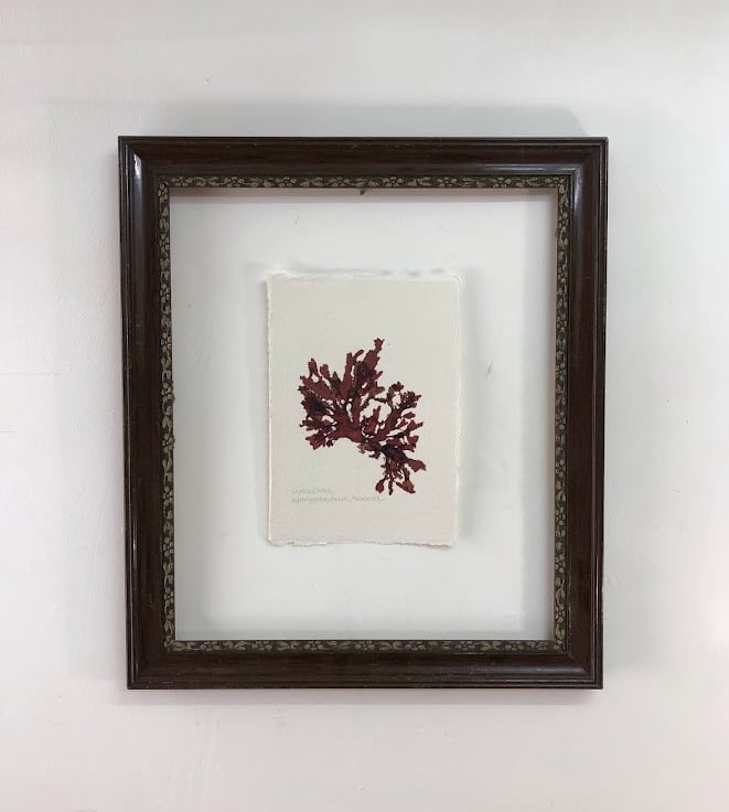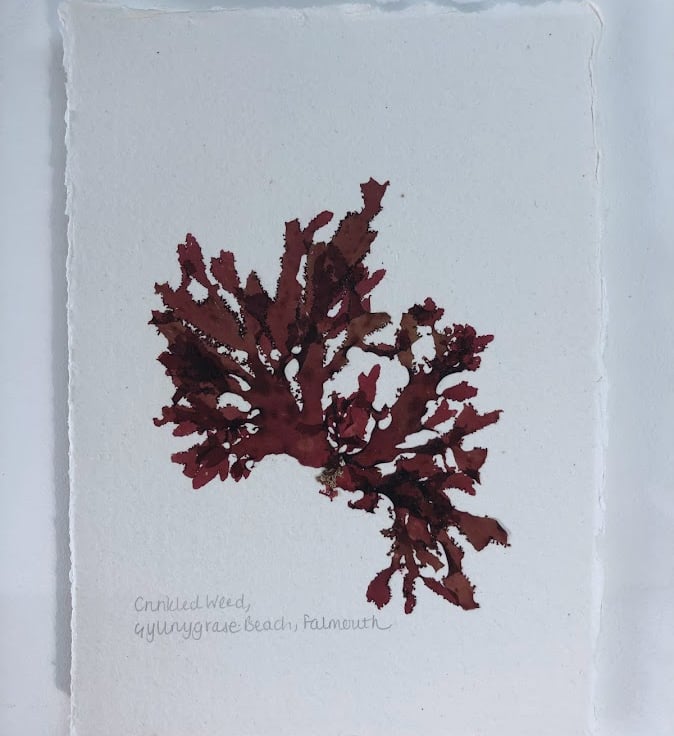 This crinkled weed, with is delicate ruffled edges, was washed up after December storms, complete with it's holdfast, on Gyllnygvase Beach in Falmouth, Cornwall. It has been pressed onto a beautiful piece of handmade paper by Khadi papers, ready for you to mount or frame as you choose.
