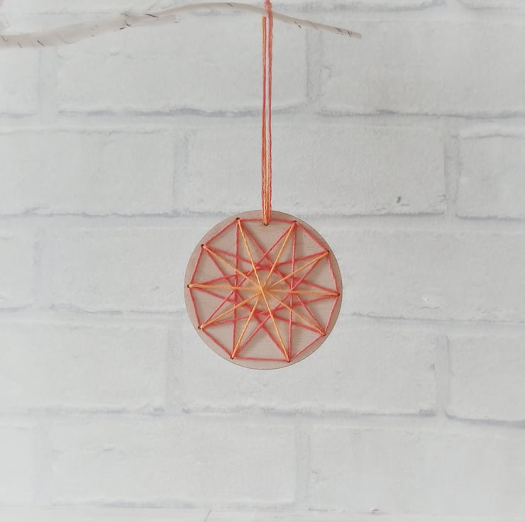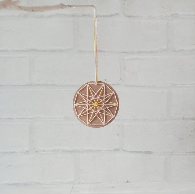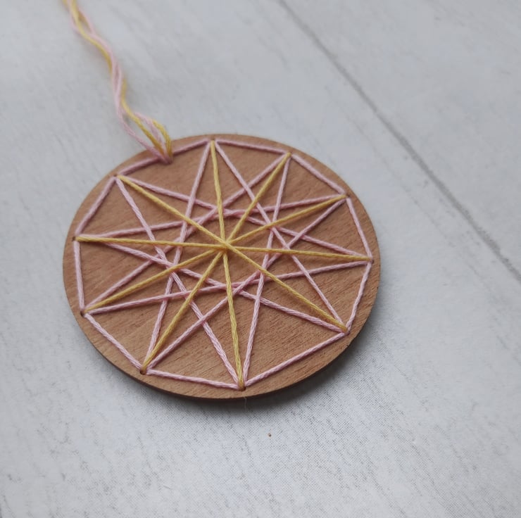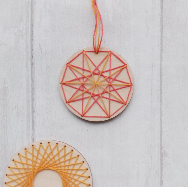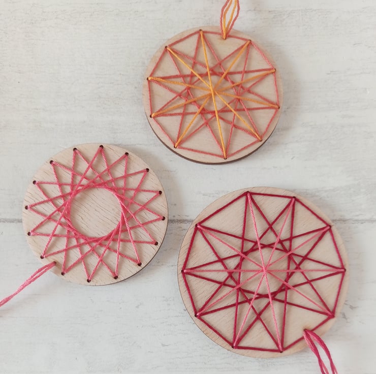 These geometric string art decorations are made from a birch plywood disc with brightly coloured embroidered detail on the front.