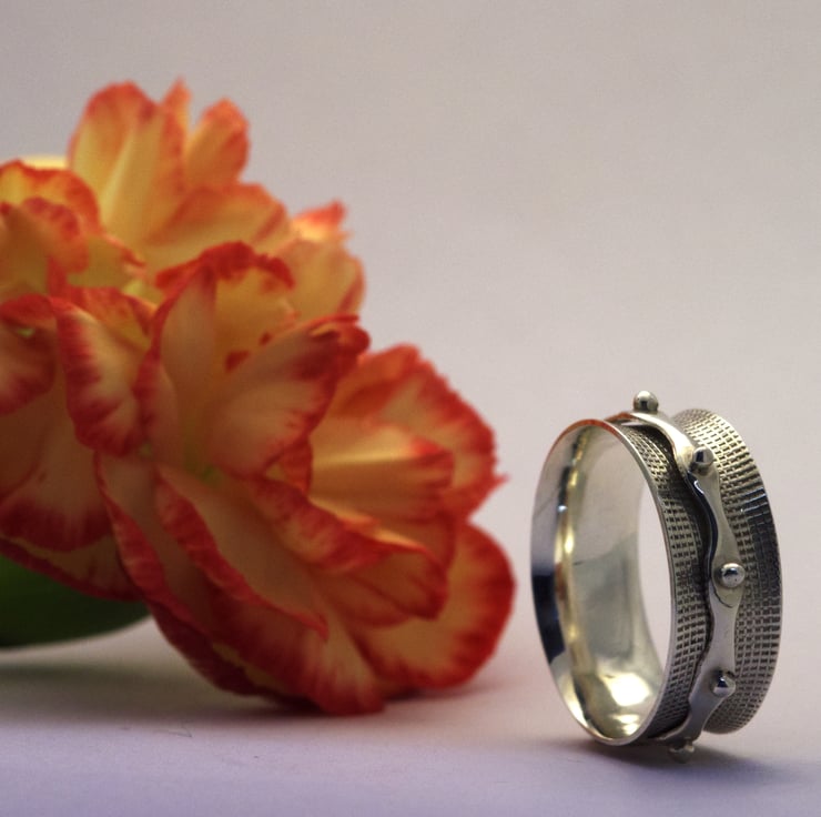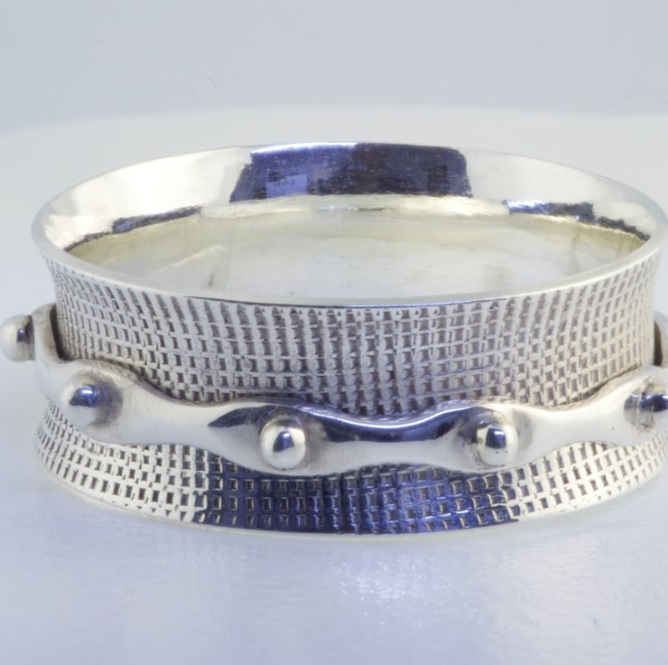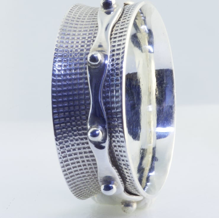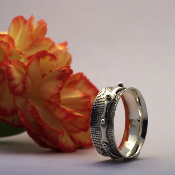 A textured sterling silver outer ring with a granulated inner ring. Size UK O&1/2. The inner ring is approximately 7.25mm wide.