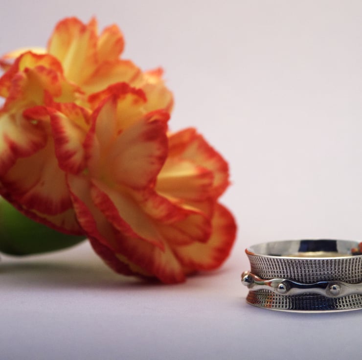 I have been making jewellery for the last few years, pushing myself to learn new skills all the time. These rings were inspired by an online training course run by Andrew Berry from At The Bench. The process involves making both rings and then carefully splaying the inner ring to capture the spinner.