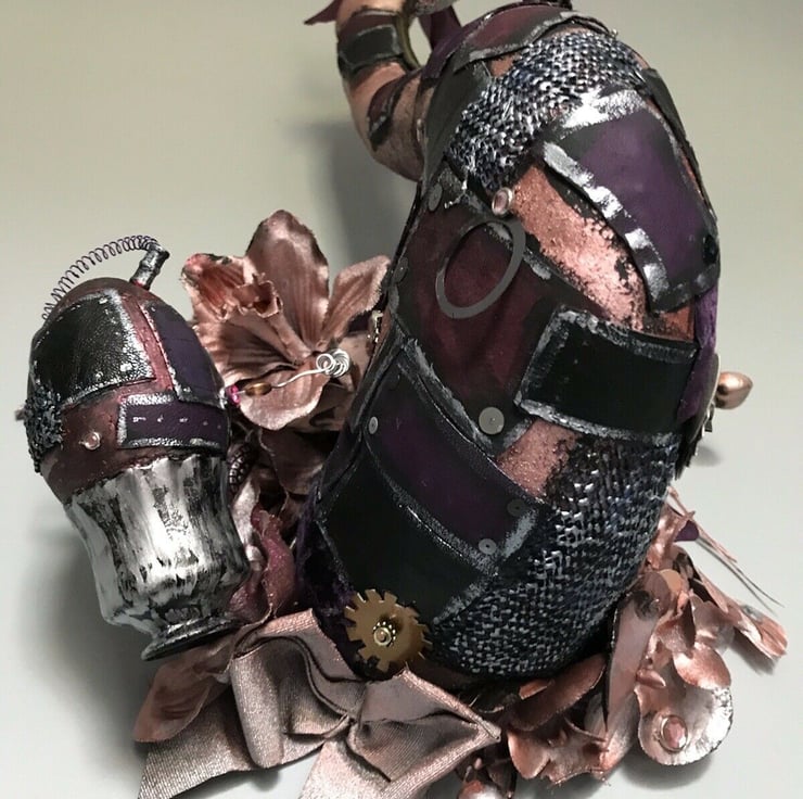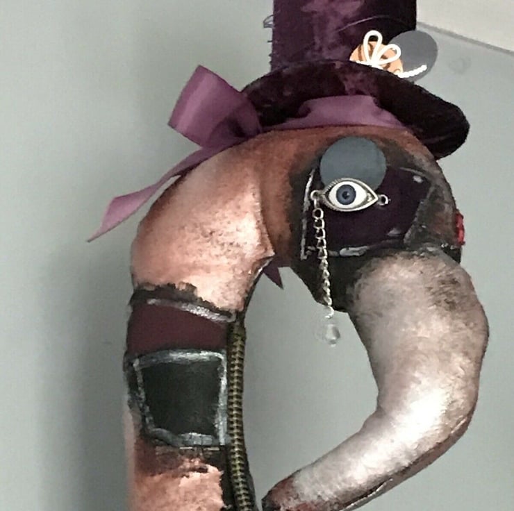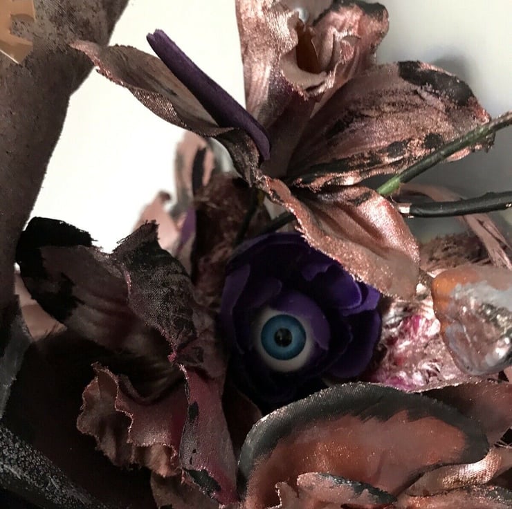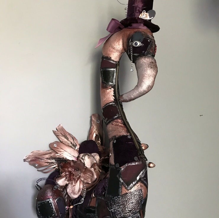 one of a kind.made from multiple materials- fabric,leather,feathers,beads.Painted in purples shades, rust copper etc.lightweight,ready to hang.65 cm high