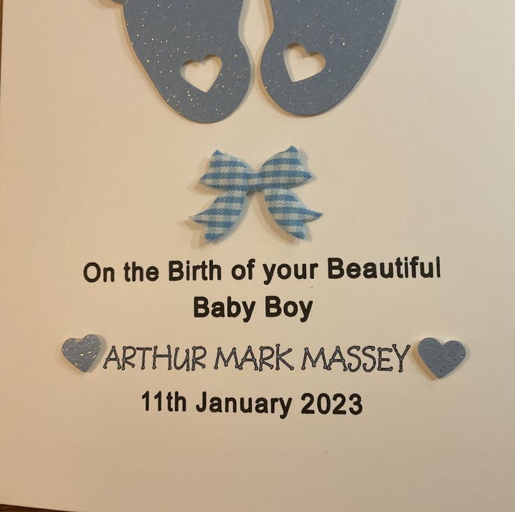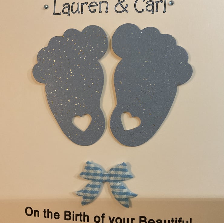 New baby card personalised with parents names , baby name and date of birth. Feet , bow and hearts 3d mounted.
