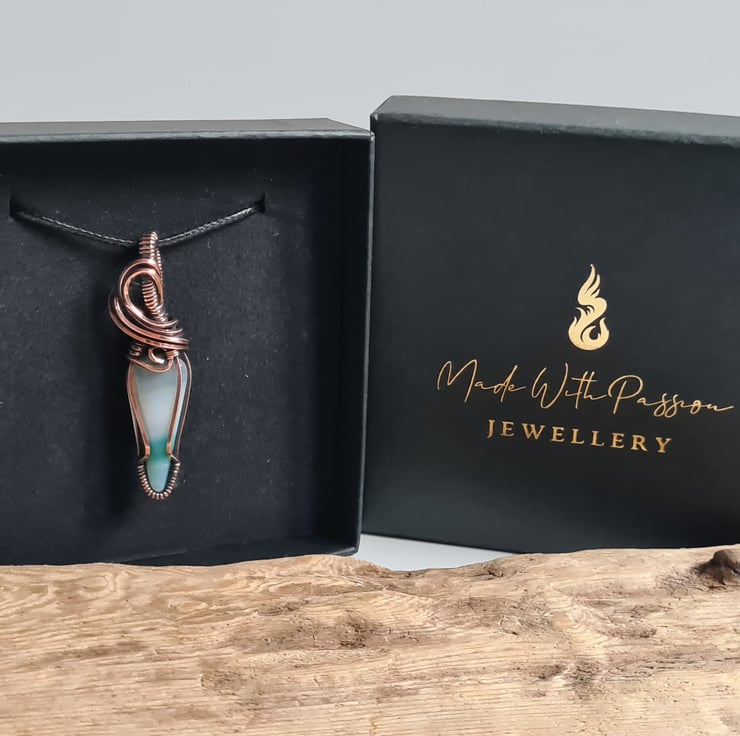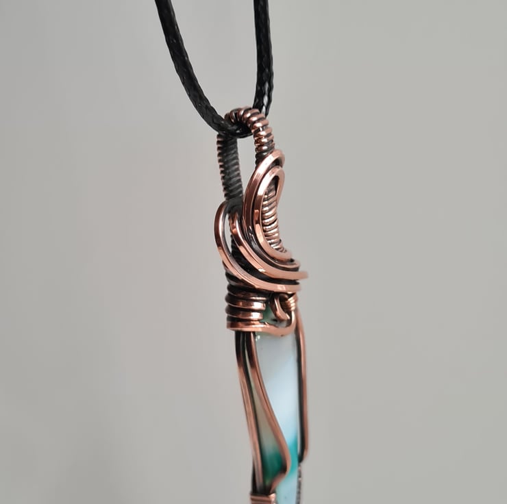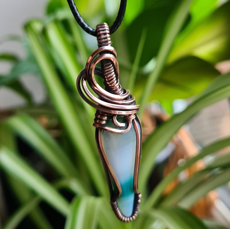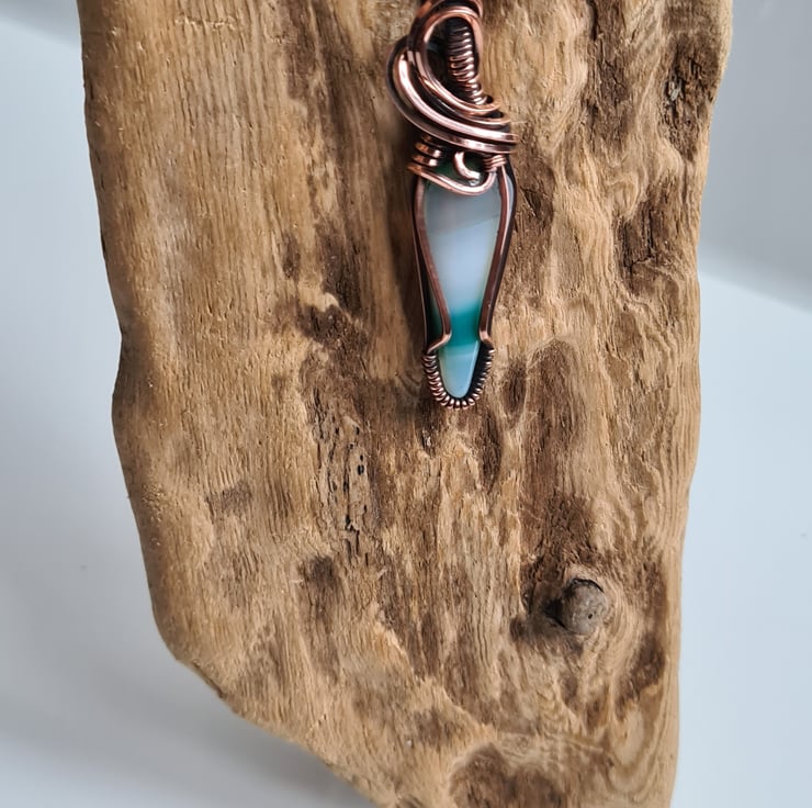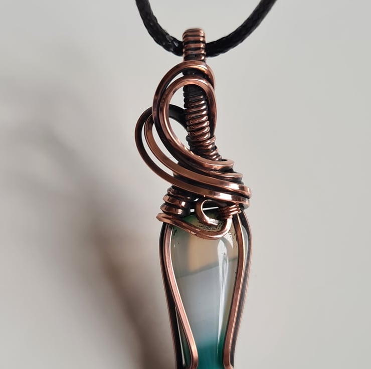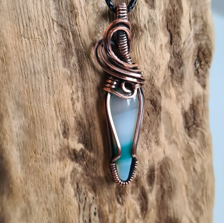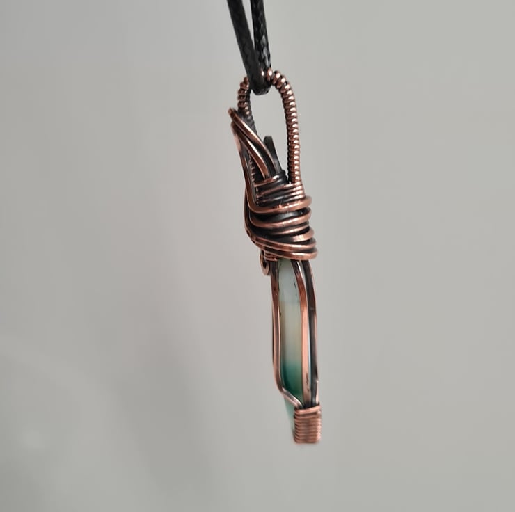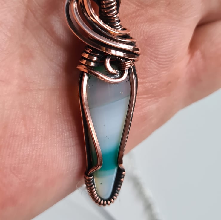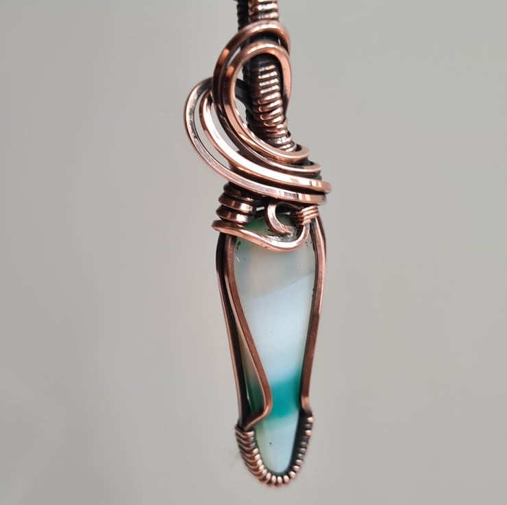This is a cute, transparent white & green Natural Botswana Agate stone which I have wrapped in copper and then antiqued and polished for the final effect.