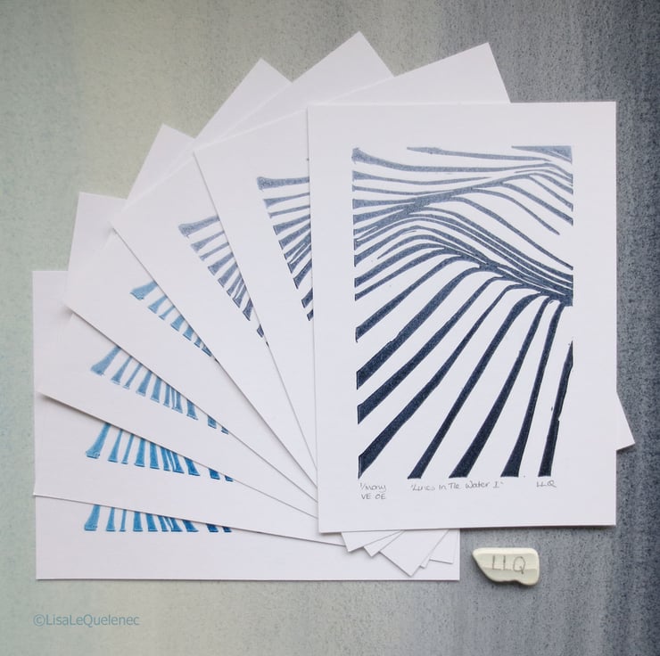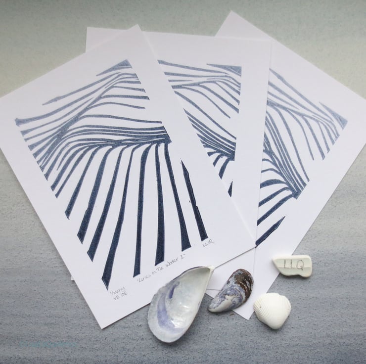 A contemporary print showing the linear flow of waves and water observed at the water's edge. This is an open and varied edition of prints that are printed in different watery colourways as can be seen in group photographs and is part of an ongoing series. The print in this listing is in shades of a denim storm grey colour.