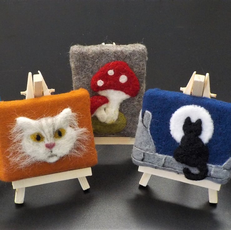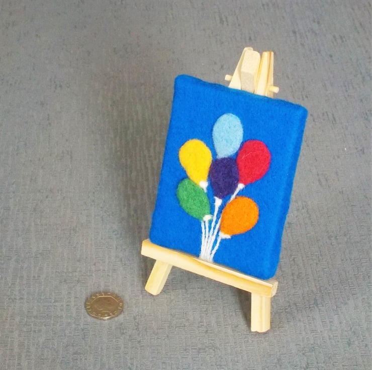 A bright and colourful bunch of balloons is a happy cheerful little gift. I have created this sweet little picture by needle-felting soft fluffy wool onto a wool felt background as though painting with wool. Then the whole has been mounted onto a tiny canvas and frame for support.