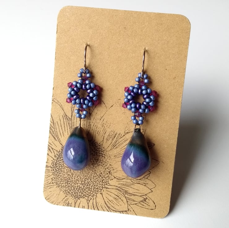 These earrings combine my own handmade beaded components together with beautiful ceramics lovingly crafted by Petra Carpreau from her studio in North Devon.