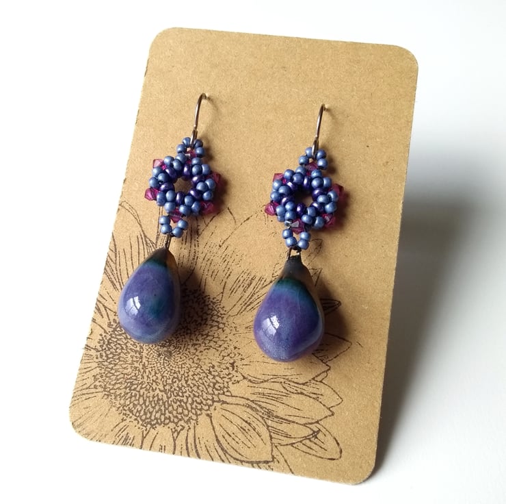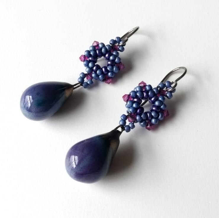 This pair features soft blue-ish purple ceramic drops, together with a hexagonal beaded component also in a purple/mauve, along with a border of sparkly 3mm crystals in fuchsia pink. This pair has been strung on hypo-allergenic titanium earwires in antique silver.