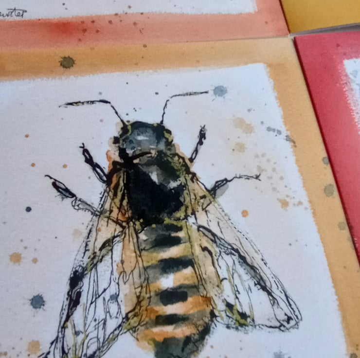 These artist cards are taken from original watercolour and ink paintings I made from a series of 12 exploring the tiniest creatures that live around us. Each card is high-quality printed locally and blank inside for your message. This set comprises Common carder bee, Honey bee, Burnet moth, Rose chafer beetle, May bug and Tiger moth.