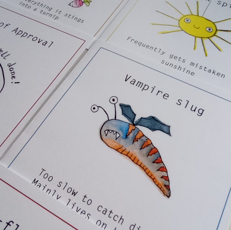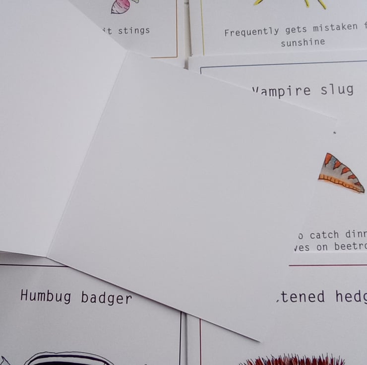 These six cards are the first set I've made of 'Anna's Animals' - animals that don't exist anywhere outside my head! So if you've ever needed a Turnip Bee in your life (or you know someone you'd like to send one to) then these are the cards for you. Each set contains six different cards, each card is 14cm square, printed to a high standard here in East Devon and comes with a white envelope.