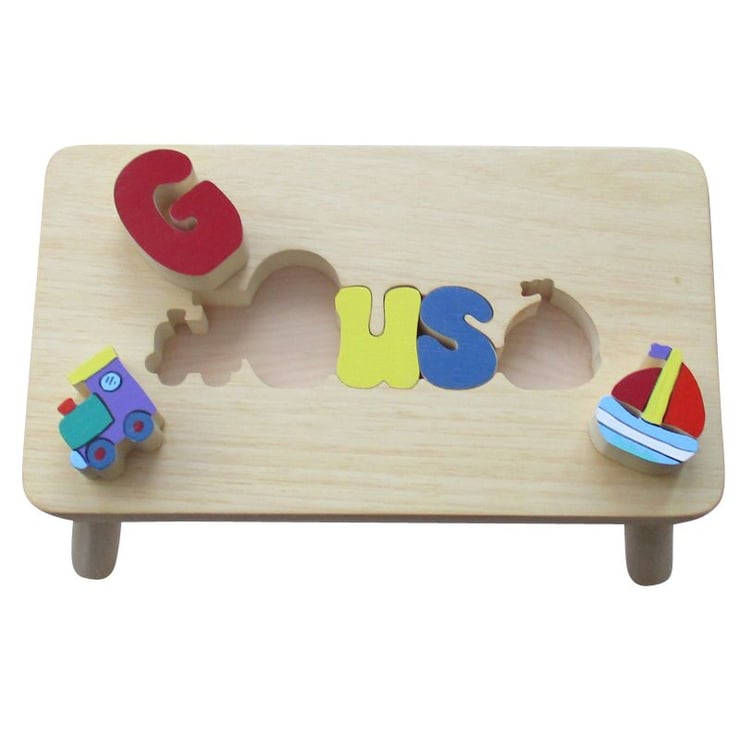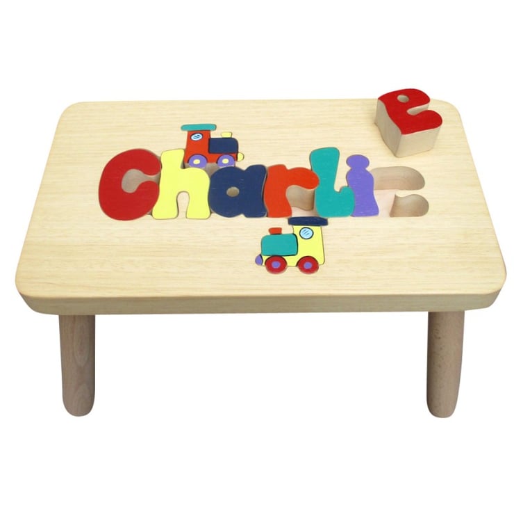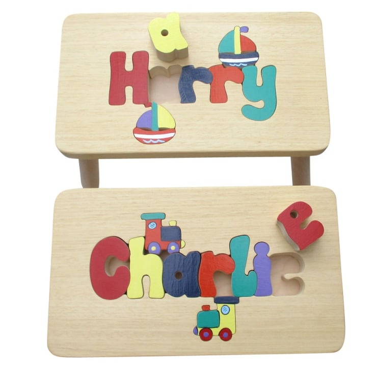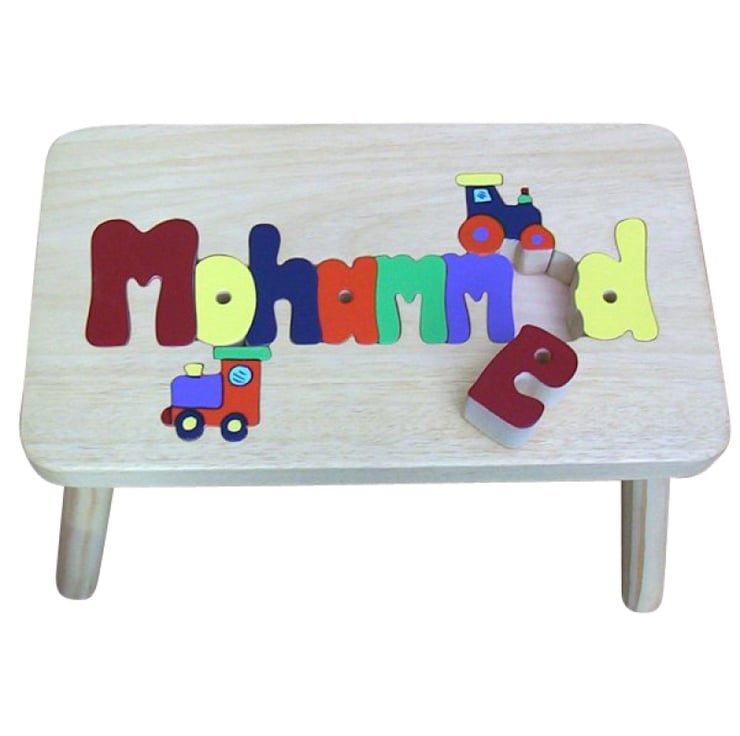 These hardwood puzzle stools are individually made to the name of your choice and finished in bright colours. They have 4 well splayed legs making then safe and sturdy to sit on. An ideal gift which is both educational and a piece of furniture. Design options can be mixed as shown in the images. The designs are added depending on the length of the name i.e. shorter names have the designs at either end and longer names have the designs above and below.