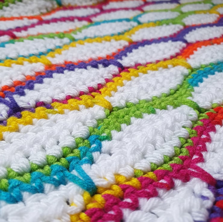 Ever since I made my first one, I have wanted to try making one with white as the main colour, and then a rainbow on the smaller rows of the blanket. I love how the colours almost merge from a distance, but up close you get lovely pops of colour that really jump out at you!