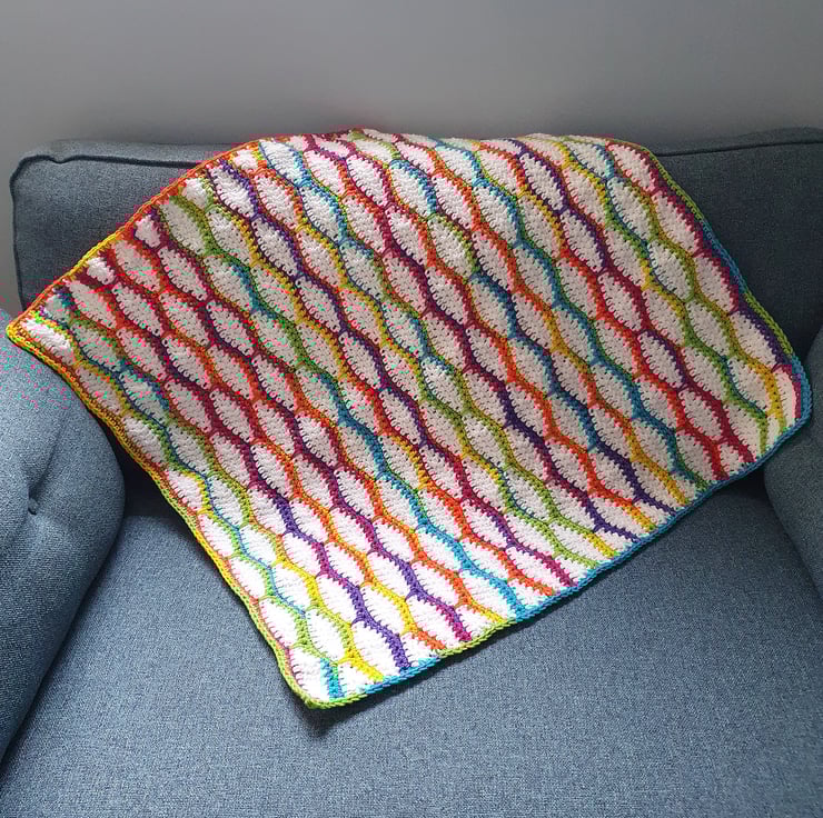 This colourful baby blanket has been crocheted in chunky yarn, giving it a beautiful squashy texture. Perfect for combating those winter walks, and will cheer up any dreary day!