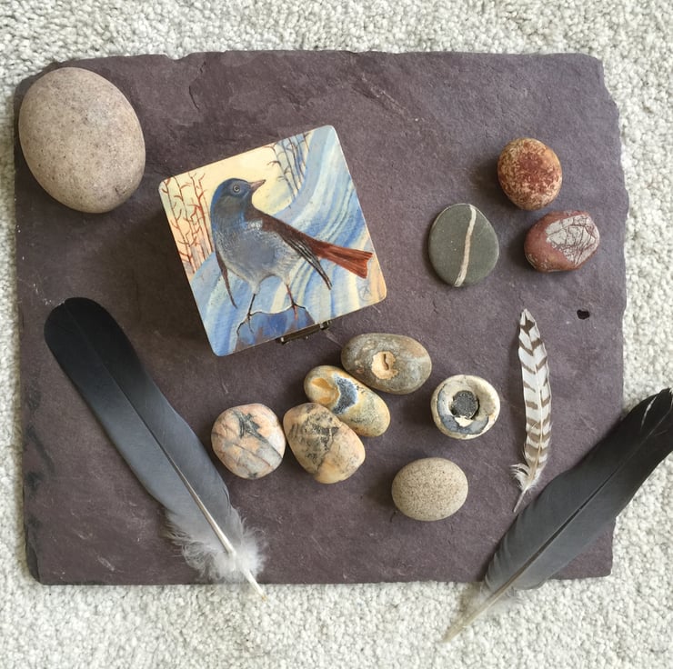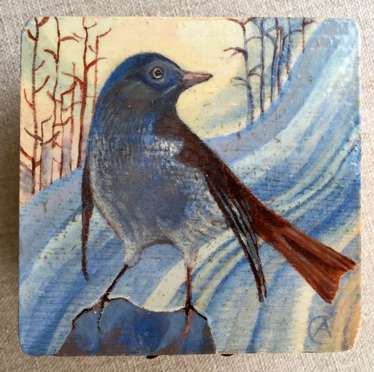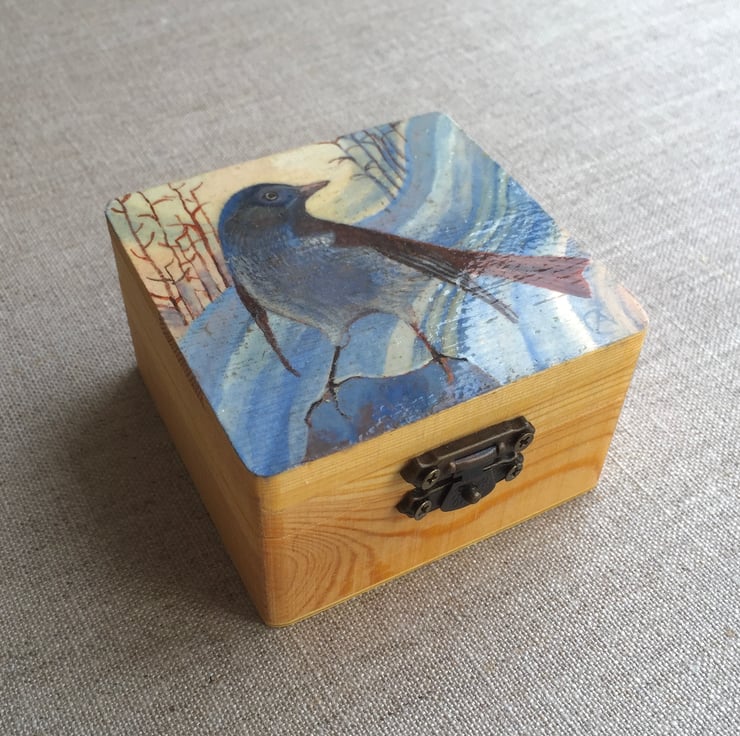 Painted wooden box, about 8cm x 8cm x 4.5cm. Original art of a female Black Redstart painted straight onto the box lid and varnished. A perfect trinket box gift, you could store jewellery, gem stones, or sweeties inside!