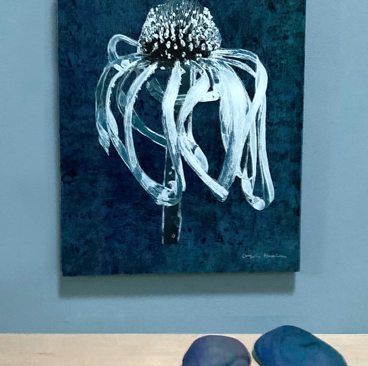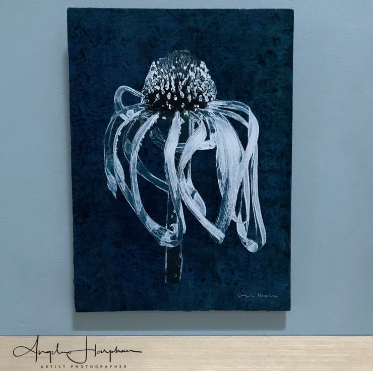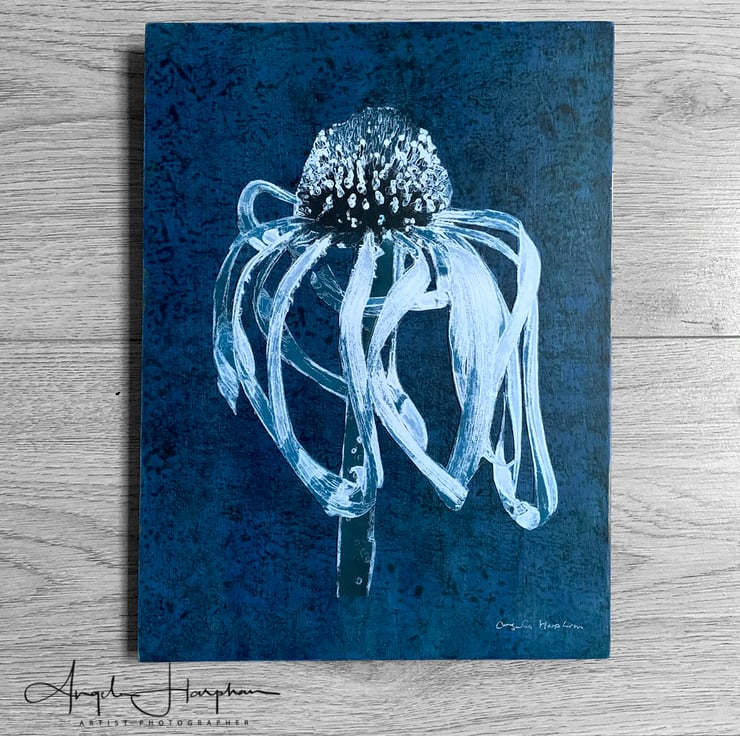 Photographic cut out of blue echinacea. A fine art photograph that I cut out and mounted on an acrylic painted wooden panel. It has cord fixings on the back ready to hang.Digitally enhanced to give an arts and crafts feel and printed on good quality photographic paper. The panel has been acrylic painted, the piece has been varnished to protect it. It can be lightly dusted with a soft cloth.