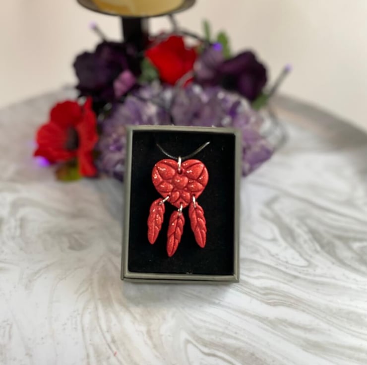 Red heart dreamcatcher statement pendant polymer clay and glitter on a black cord necklace. Handmade polymer clay and ultra fine red glitter dreamcatcher heart pendant on a 18 inch black cord necklace with silver plated clasp and extension chain. The pendant is finished with a clear topcoat of varnish to seal and protect the necklace.