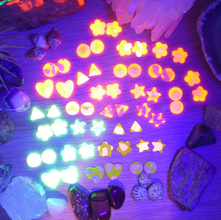 These earrings are made from lemon yellow, neon pink and neon green polymer clay. They have been hand painted with pastel neon paint. The pink and green clays and the paint are all UV reactive and will glow under UV light.
