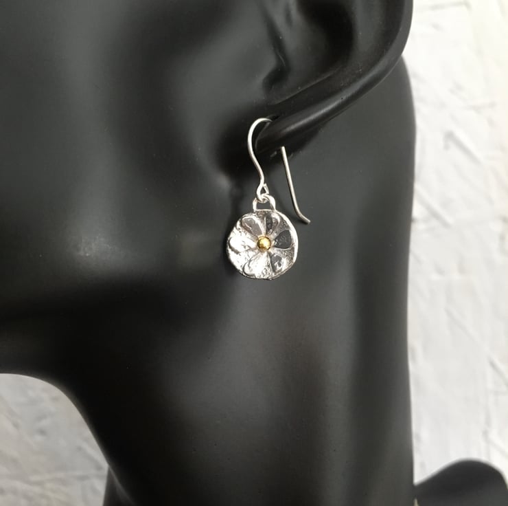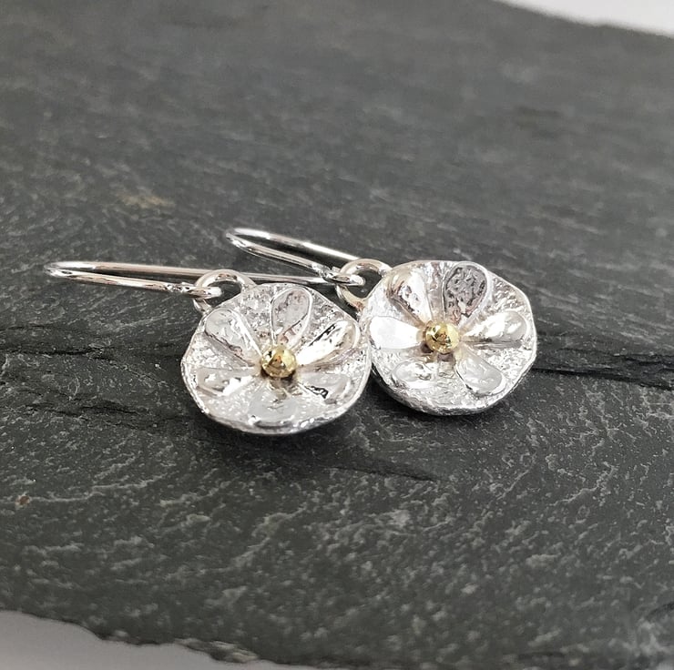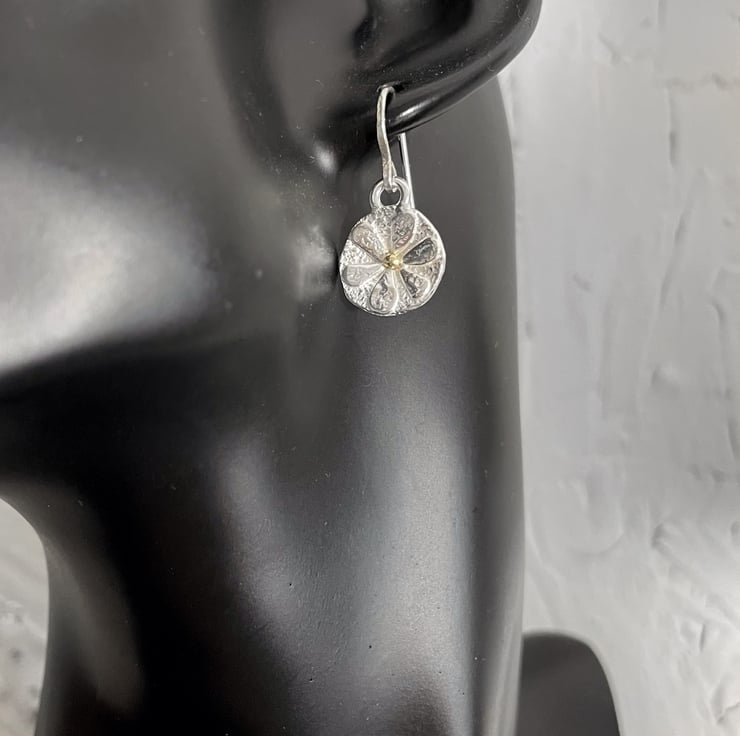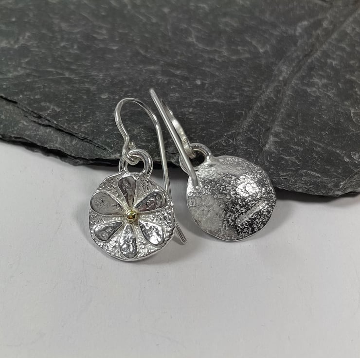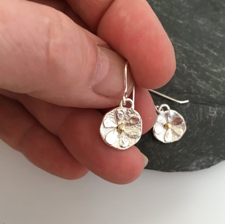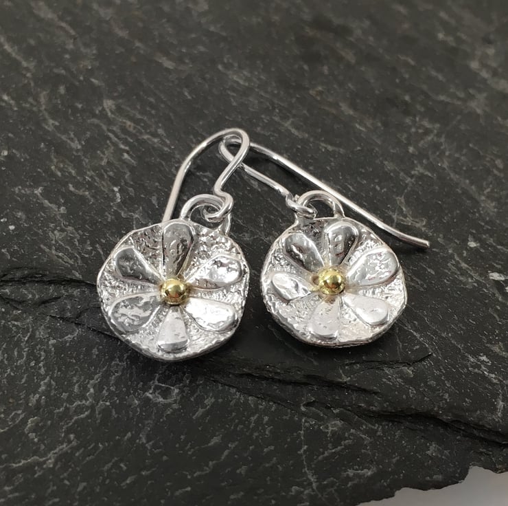Small textured silver stylised flower earrings with 18ct gold centres.