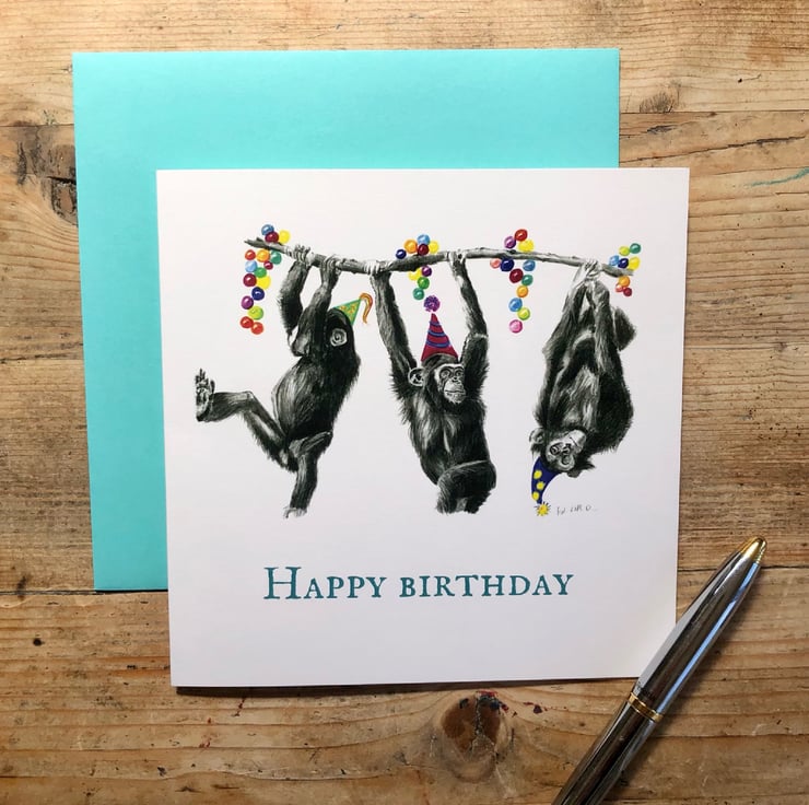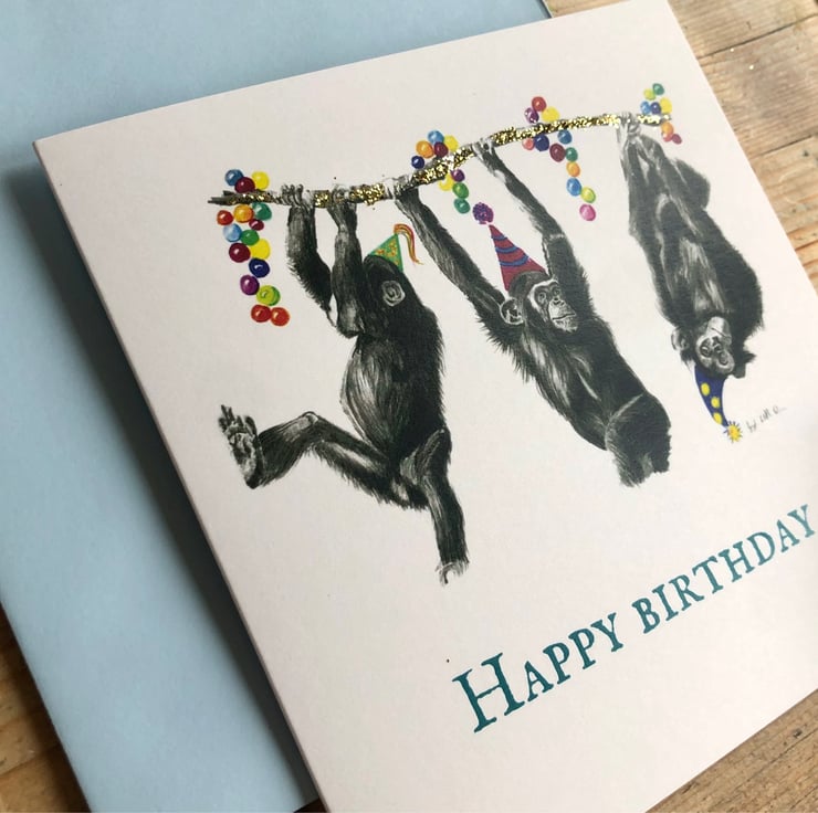These fantastic fun partying chimps make the perfect birthday celebration card! Brought to life with hand-applied glitter. Originally hand drawn by Sophie in coloured pencil. Guaranteed to bring a smile to anyone’s face!