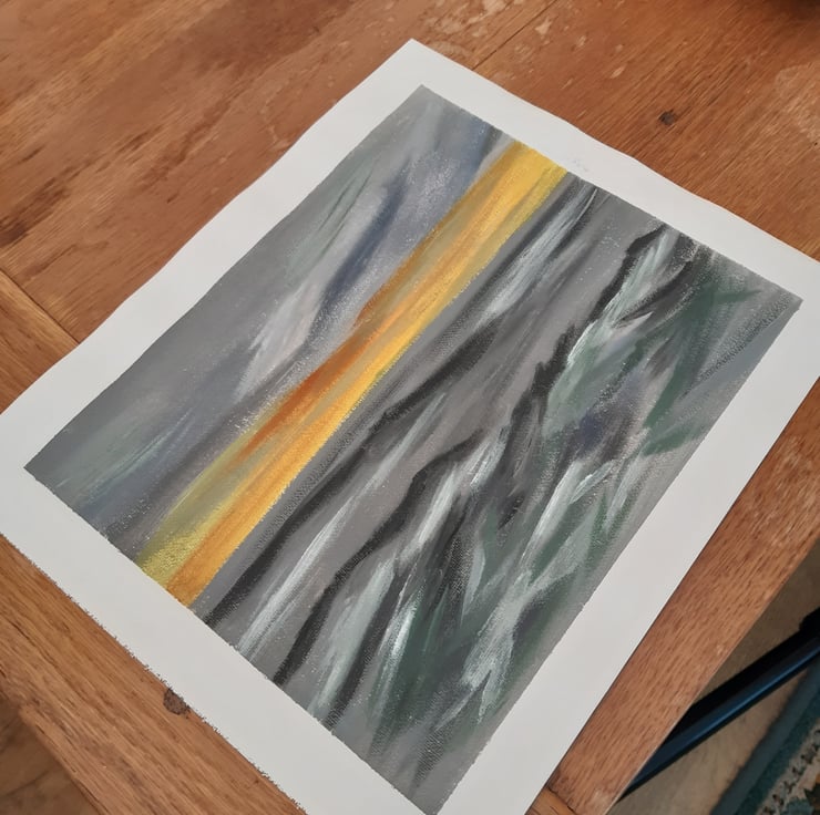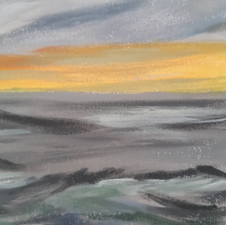 acrylic, painting on canvas sheet 10 times 12 inches approximately 250 /300 mm. Rustic rustic sea seen crashing waves, the waters towards the edge, revealing the green texture towards the sea , as the waters thining as it comes near to the shore.