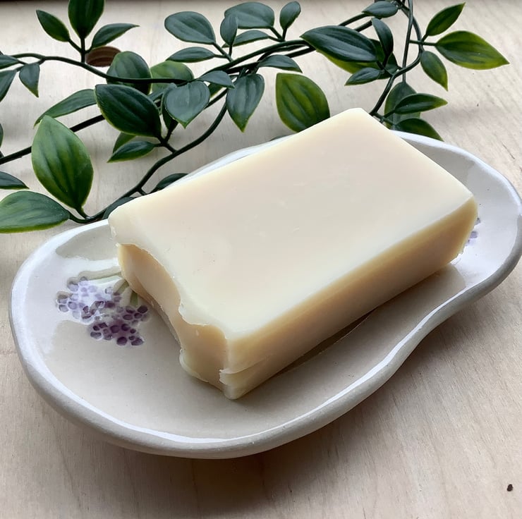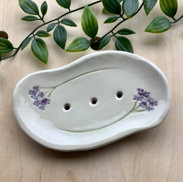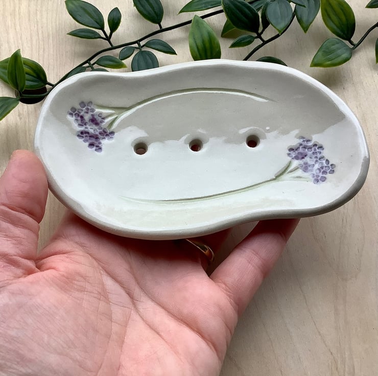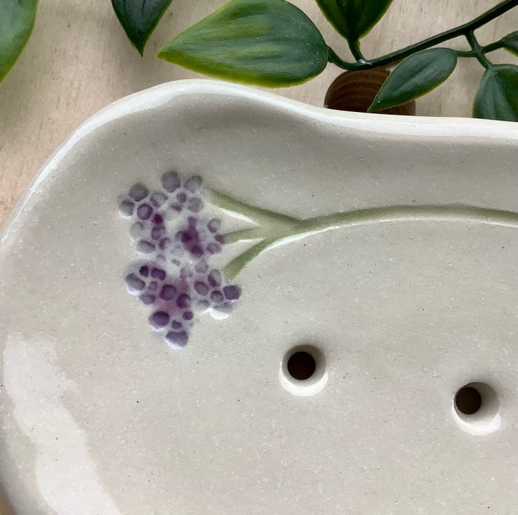 Handmade stoneware soap dish, measuring approximately 14cm in length and 7.5cm in width. Slightly dish shaped with foot ring and 3 drainage holes. Decorated using hand carved stamps and finished with a colour wash and clear food safe glaze. Dishwasher and frost proof, made for everyday use.