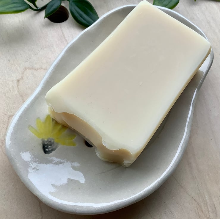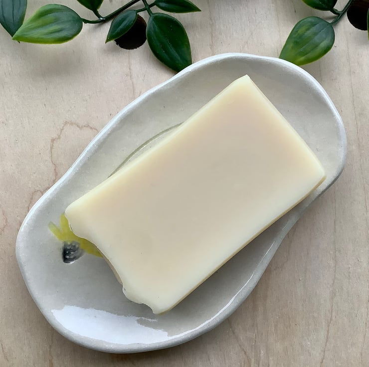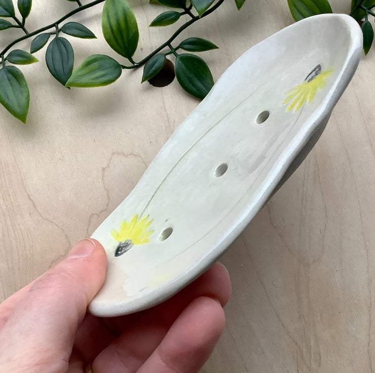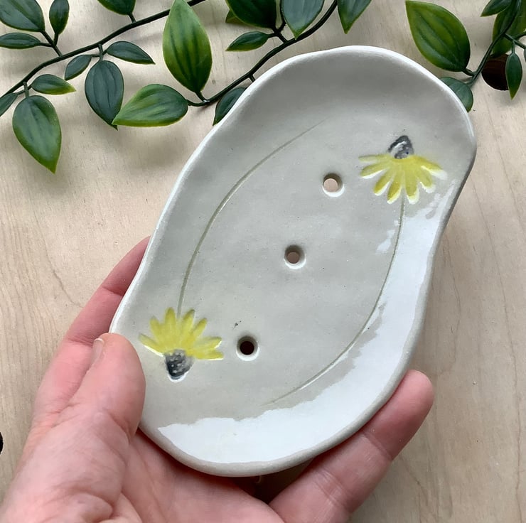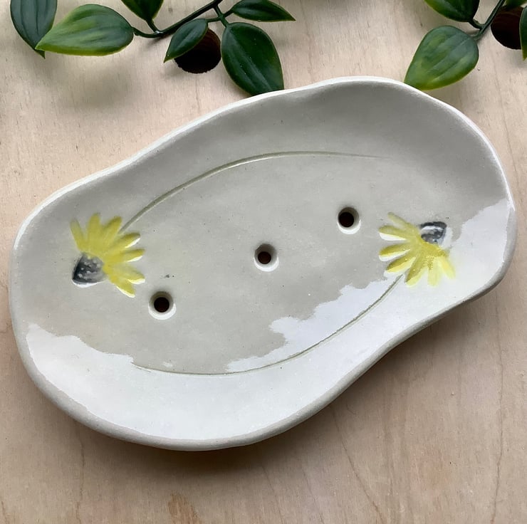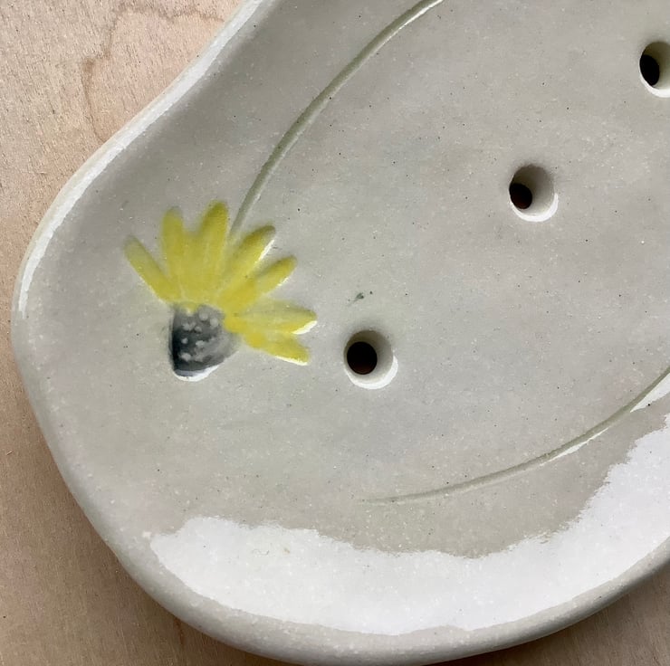 Handmade stoneware soap dish, measuring approximately 14cm in length and 7.5cm in width. Slightly dish shaped with foot ring and 3 drainage holes. Decorated using hand carved stamps and finished with a colour wash and clear food safe glaze. Dishwasher and frost proof, made for everyday use.
