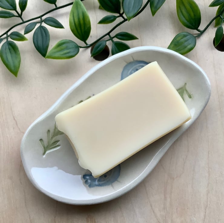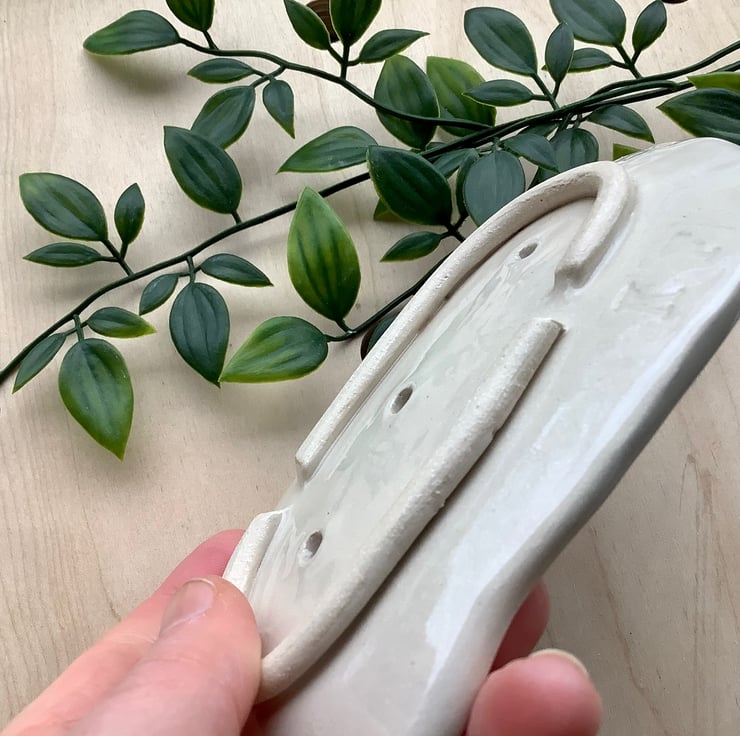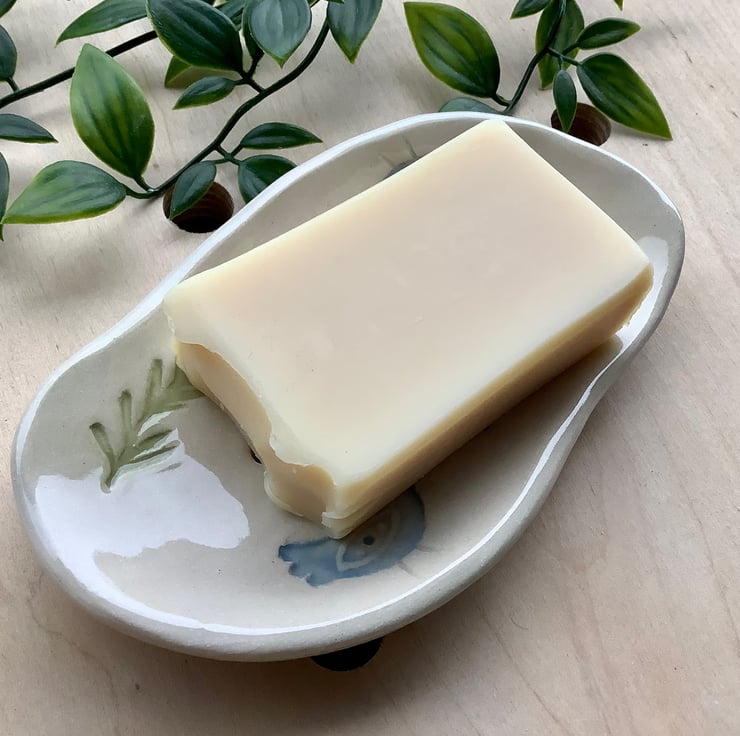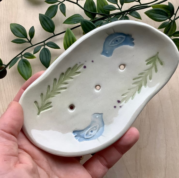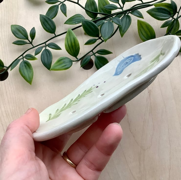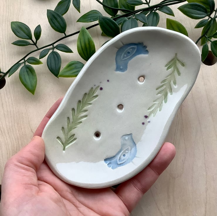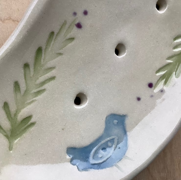 Handmade stoneware soap dish, measuring approximately 14cm in length and 7.5cm in width. Slightly dish shaped with foot ring and 3 drainage holes. Decorated using hand carved stamps and finished with a colour wash and clear food safe glaze. Dishwasher and frost proof, made for everyday use.