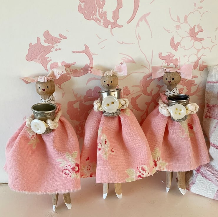 A gorgeous handmade peg doll, made from a vintage dolly peg and wearing a dress made from vintage fabric. She is holding a vintage thimble, which is removable and useable - but which finger it will fit, I cannot say - they all vary in size.