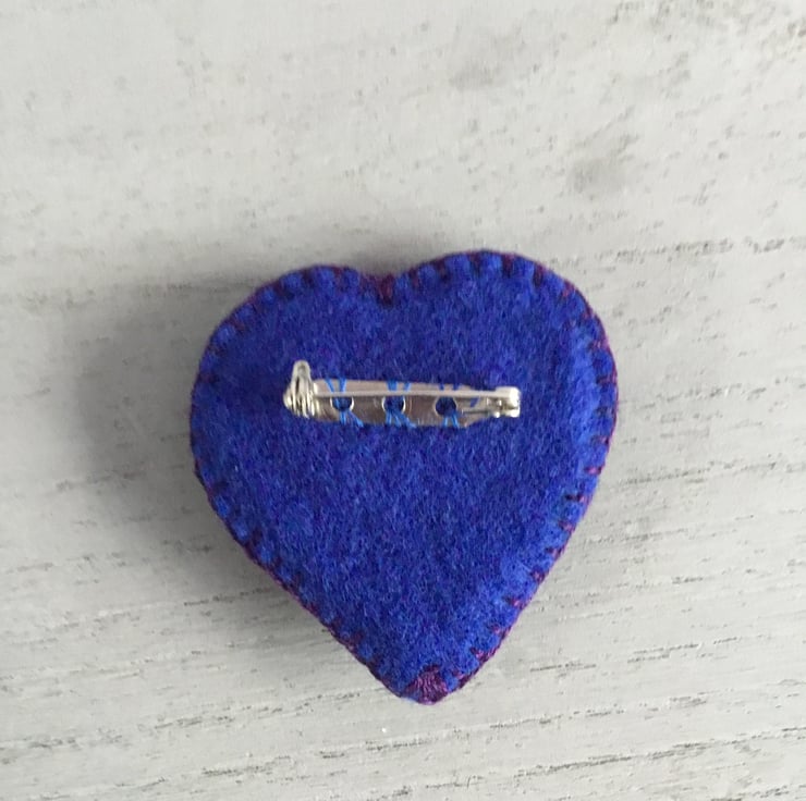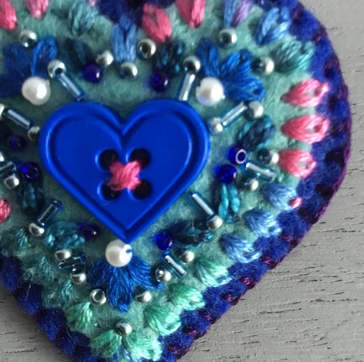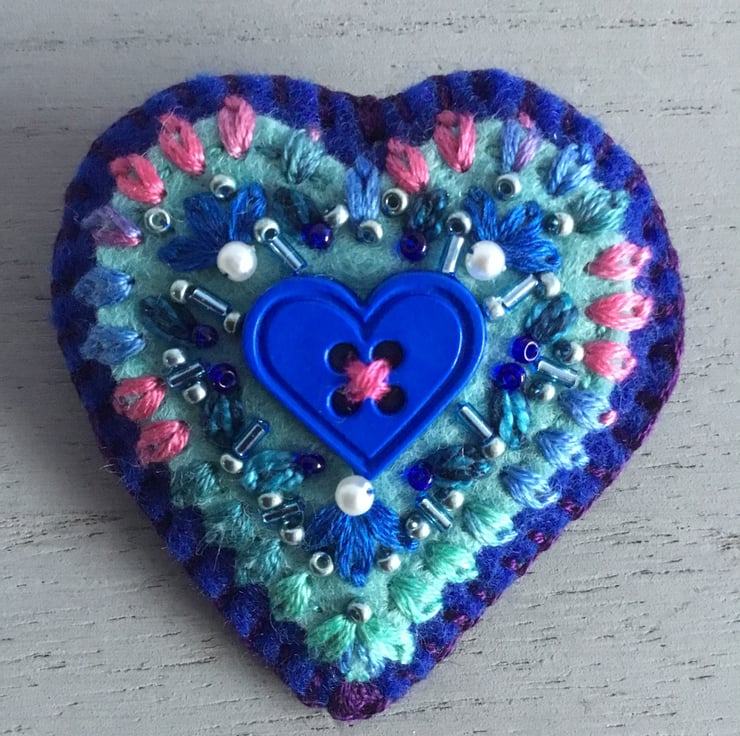 This Hand Embroidered Blue Heart Brooch has a blue Heart button in bluebell blue, stitched onto heart shaped felt, in shades of blue. Lazy Daisy and Blanket Stitches in blue and pink embroidery threads are hand embroidered, with pearls, bugle and seed beads, around this blue Heart button.