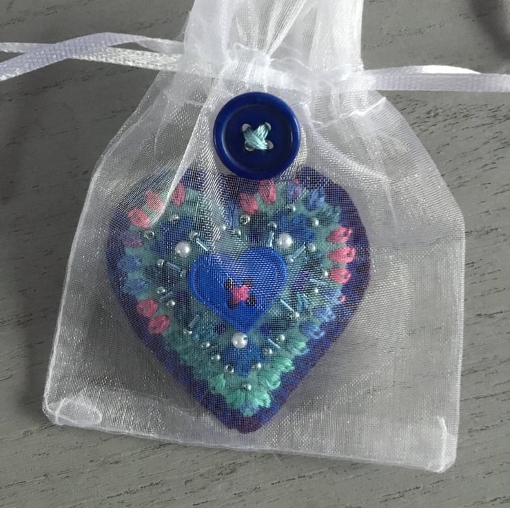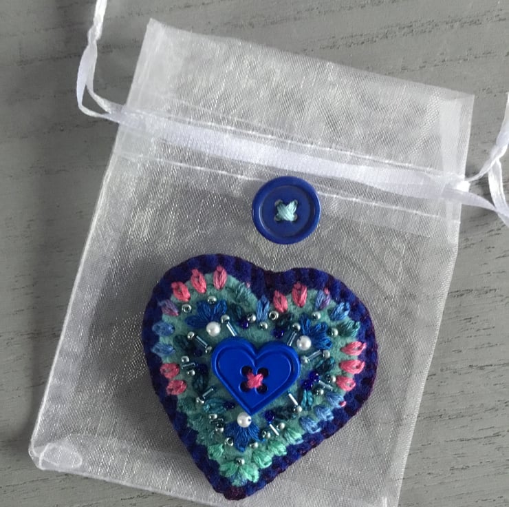 This Hand Embroidered Blue Heart Brooch is gift wrapped in an organza bag, decorated with a blue button. Also a protective bag to keep the brooch in when not worn. An ideal birthday, friendship or thank you gift. It’s light so makes an ideal letterbox gift.