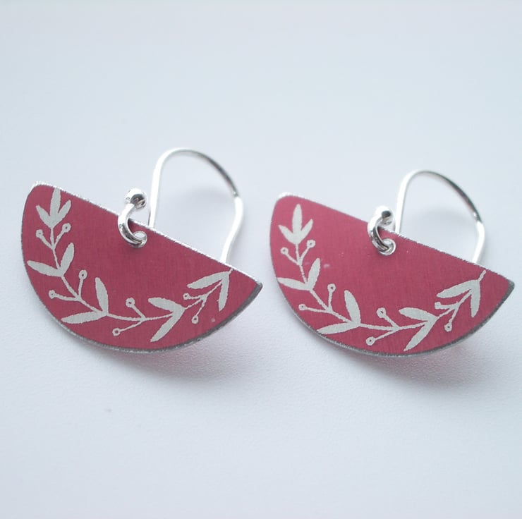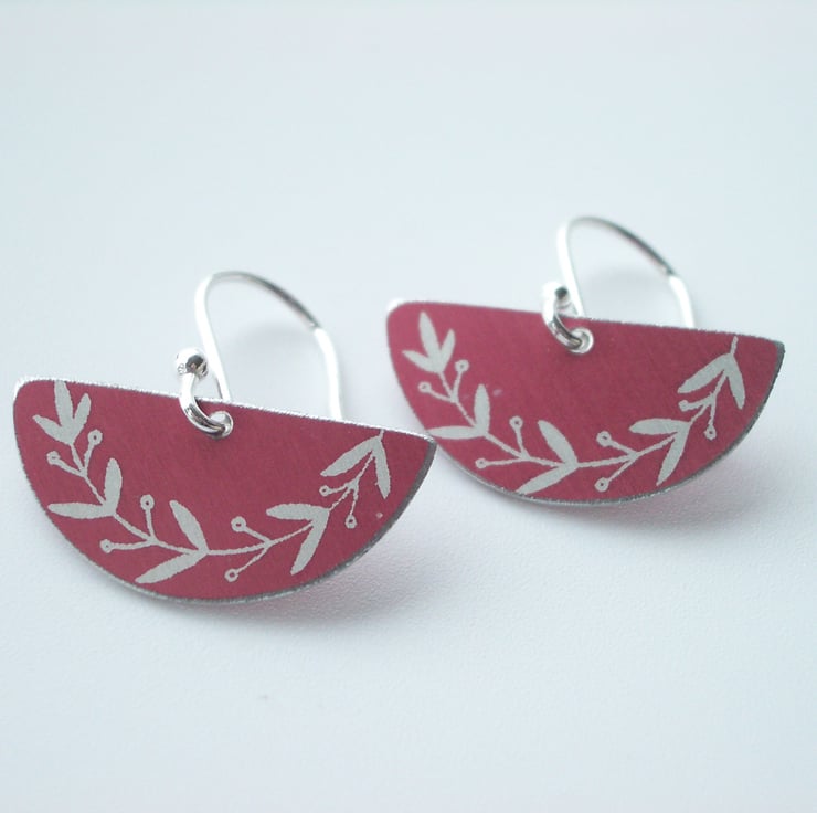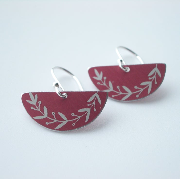 These semi circle earrings are made from aluminium which is hand dyed by me in burgundy and printed with a silver circular wreath of olive leaves. I then cut out the semi circles with a piercing saw and file the edges to reveal the shiny aluminium underneath.