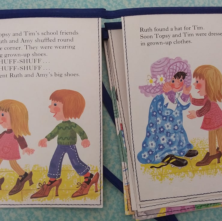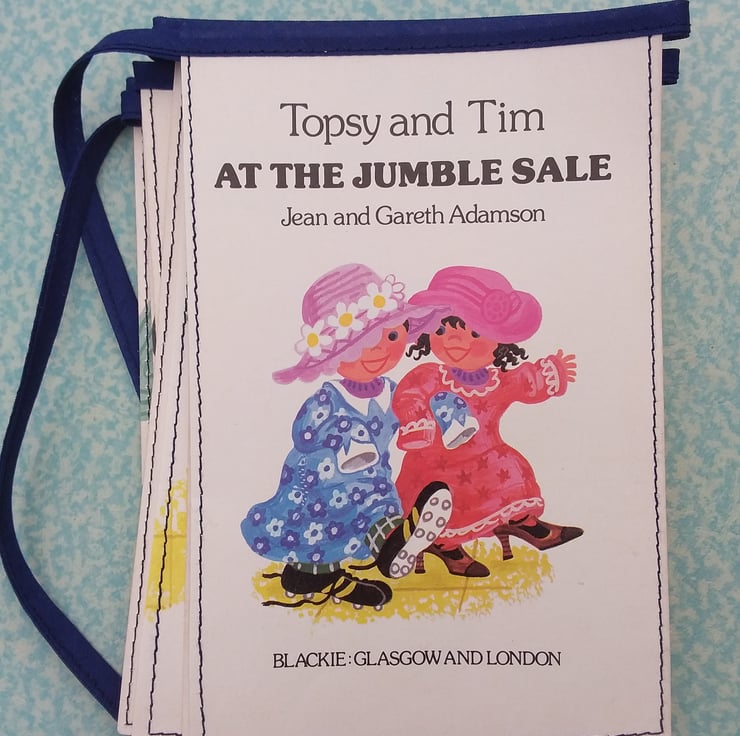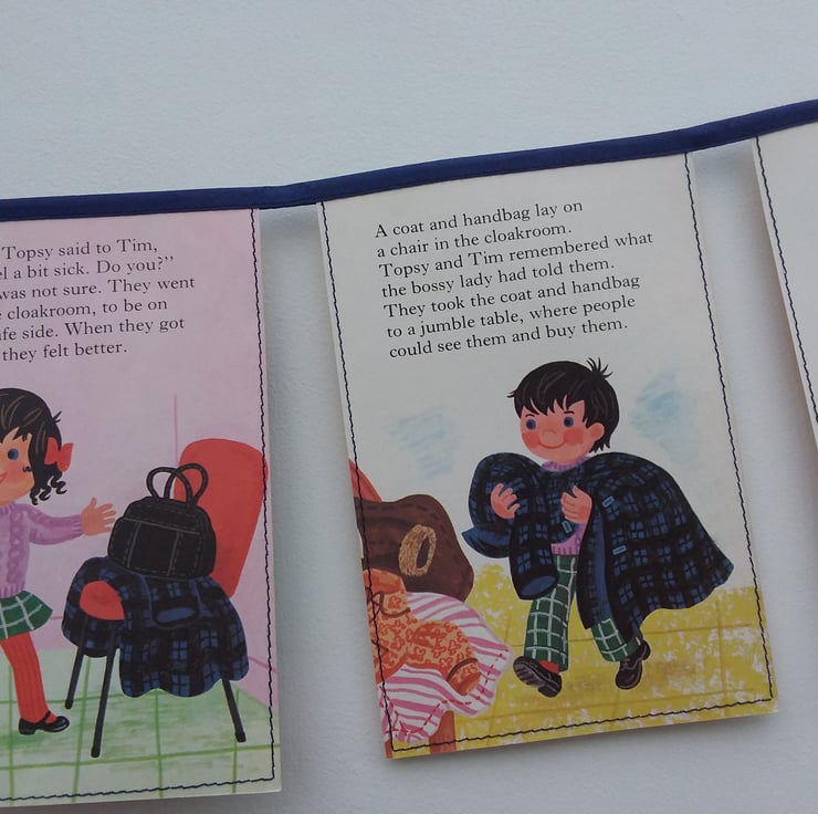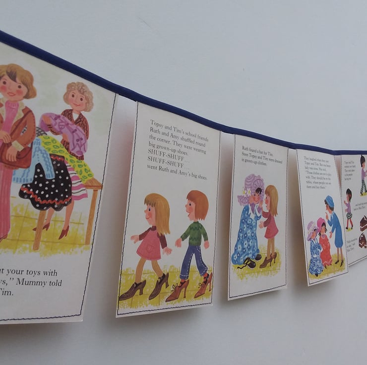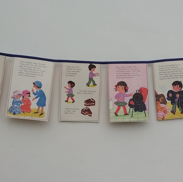 A length of bunting made from an entire vintage Topsy and Tim book - 'Topsy and Tim at the Jumble Sale'.
