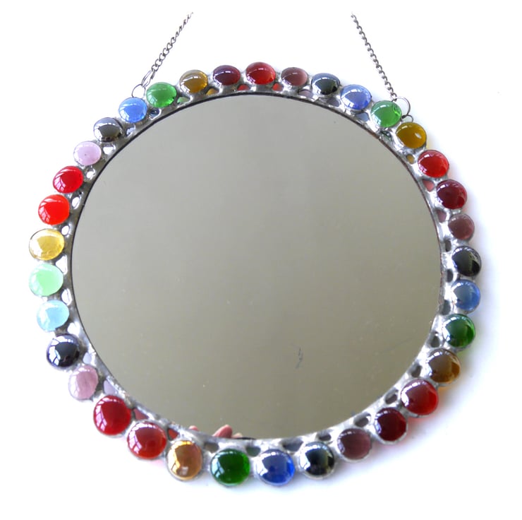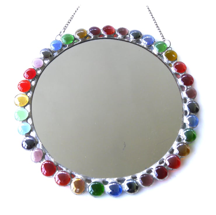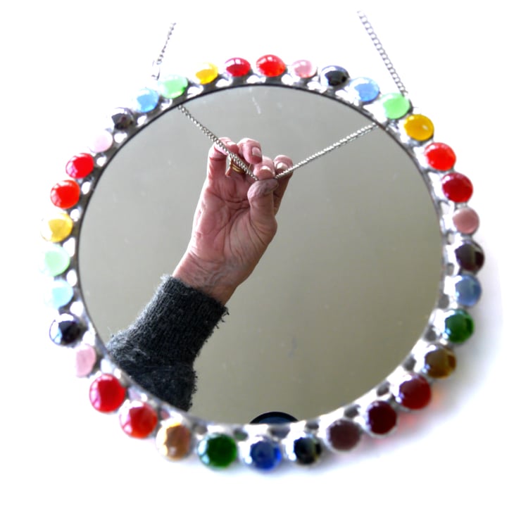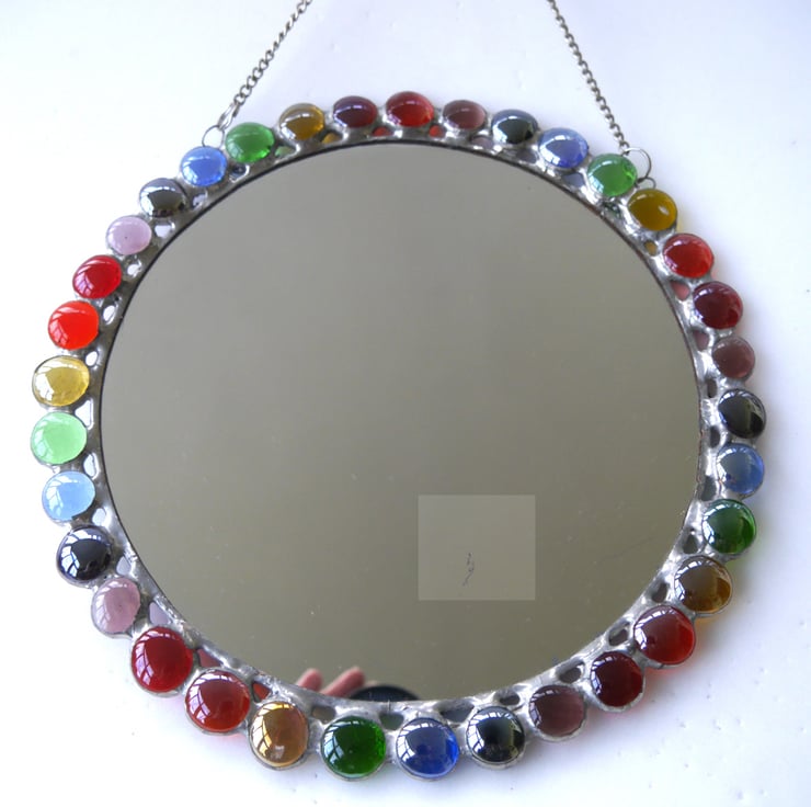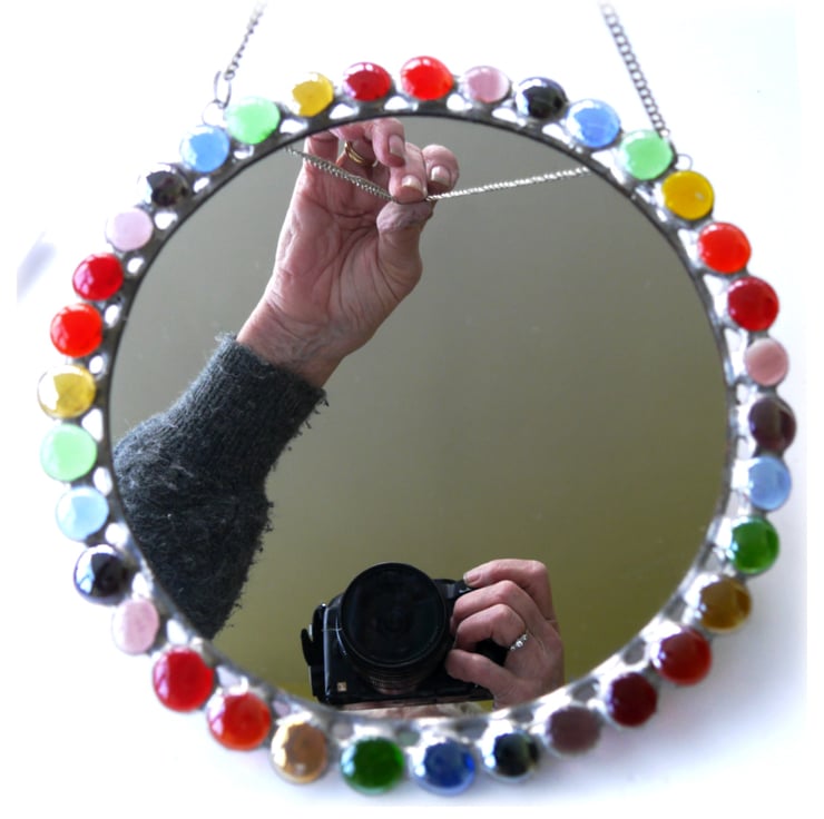 It comprises a circular mirror tile which I have framed with a rainbow collection of lots of glass nuggets. The mirror and each of the nuggets has been individually copper foiled and then they were all soldered together.
